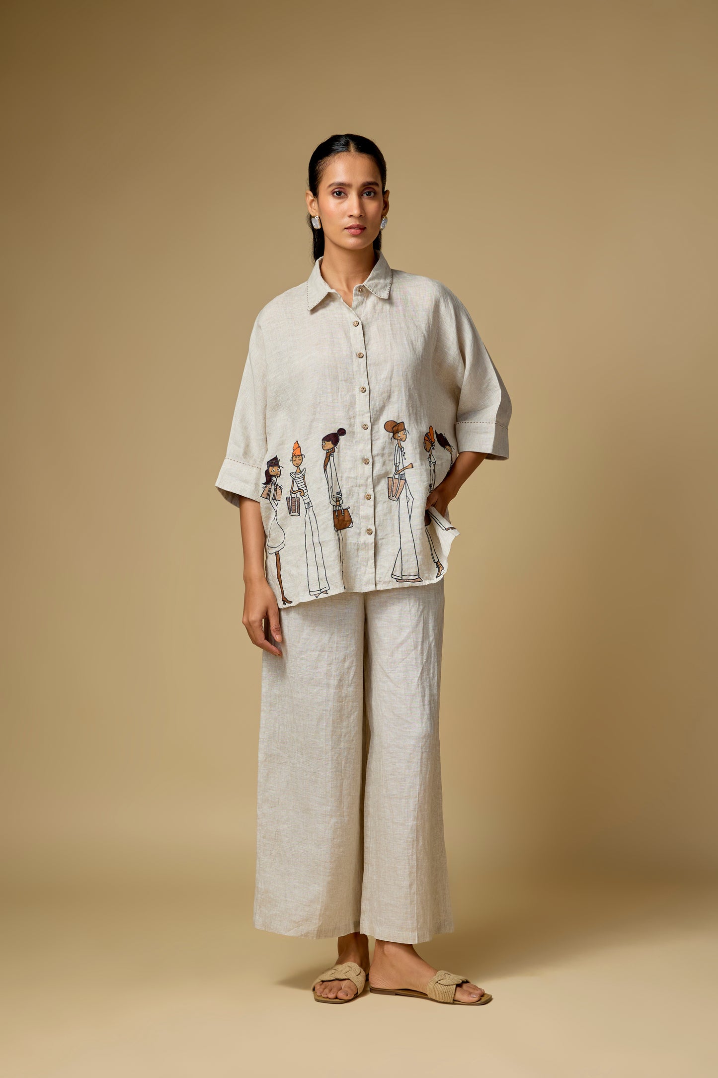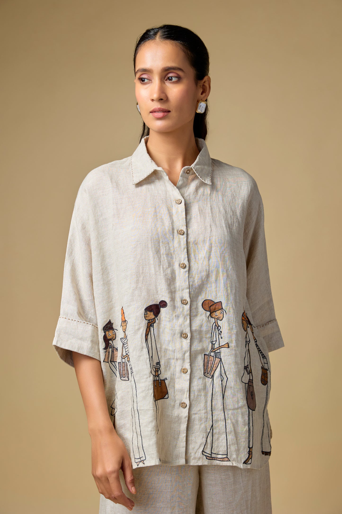 Beige Cubic Horse Emb Half Sleeve Shirt