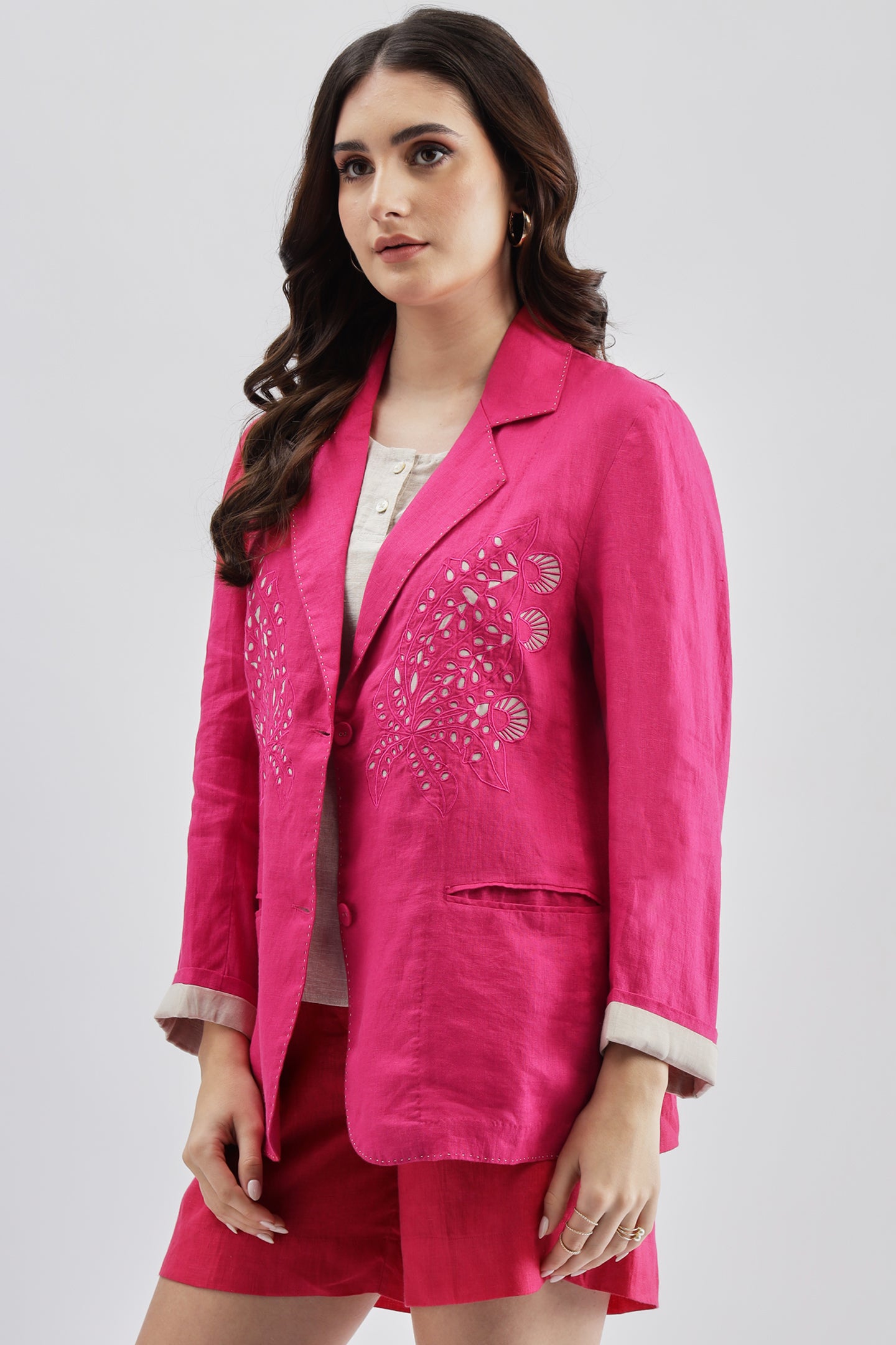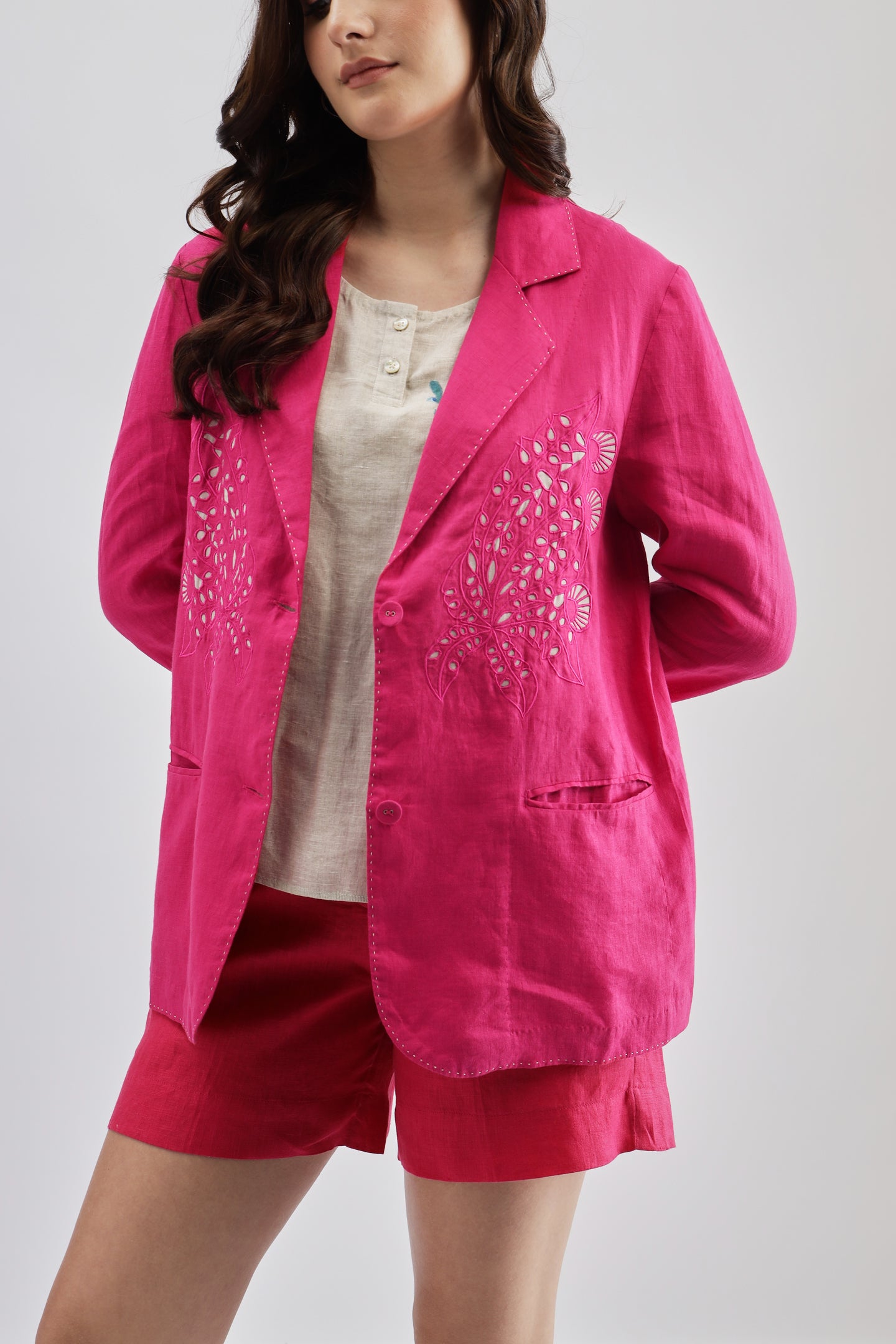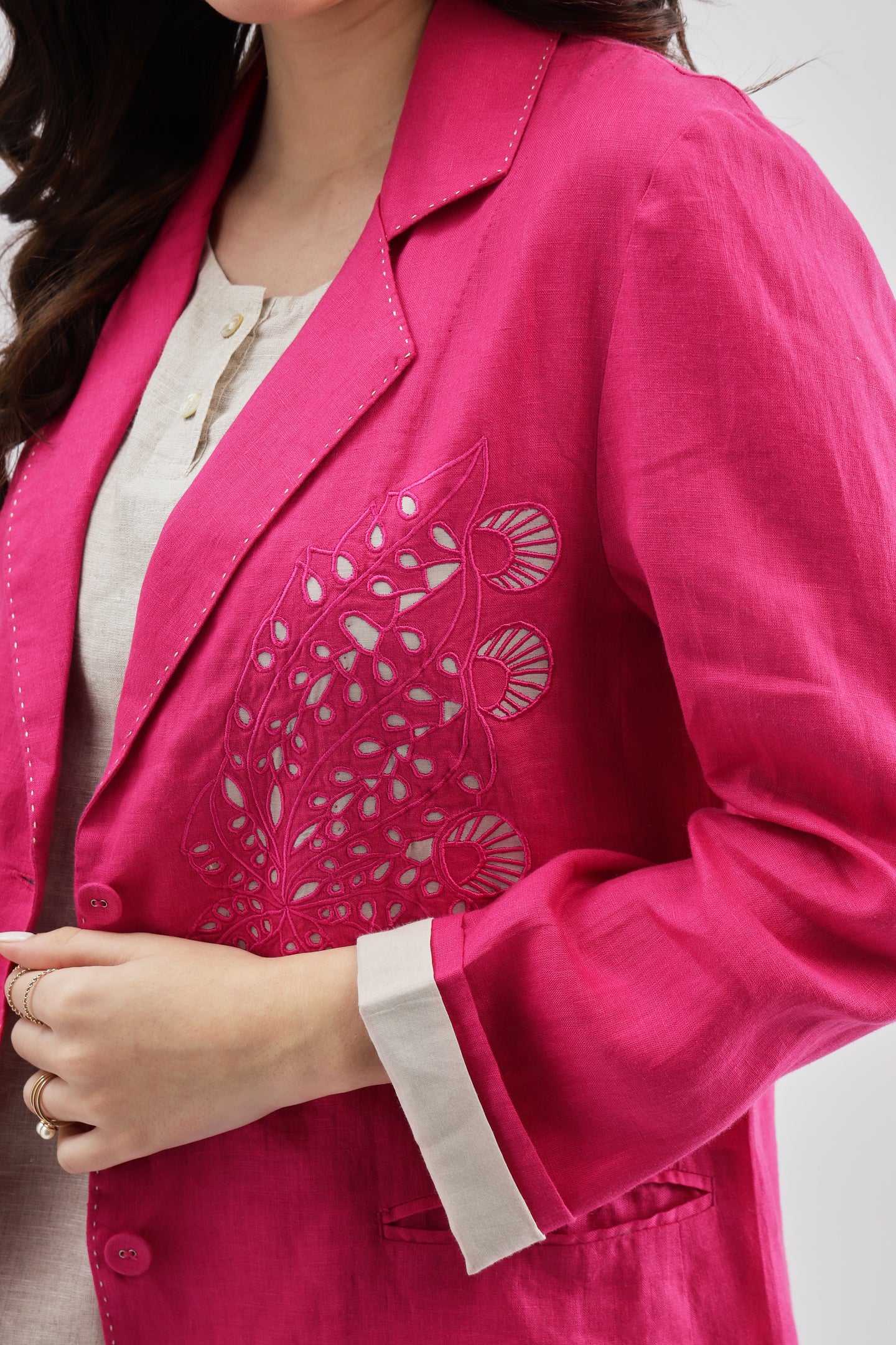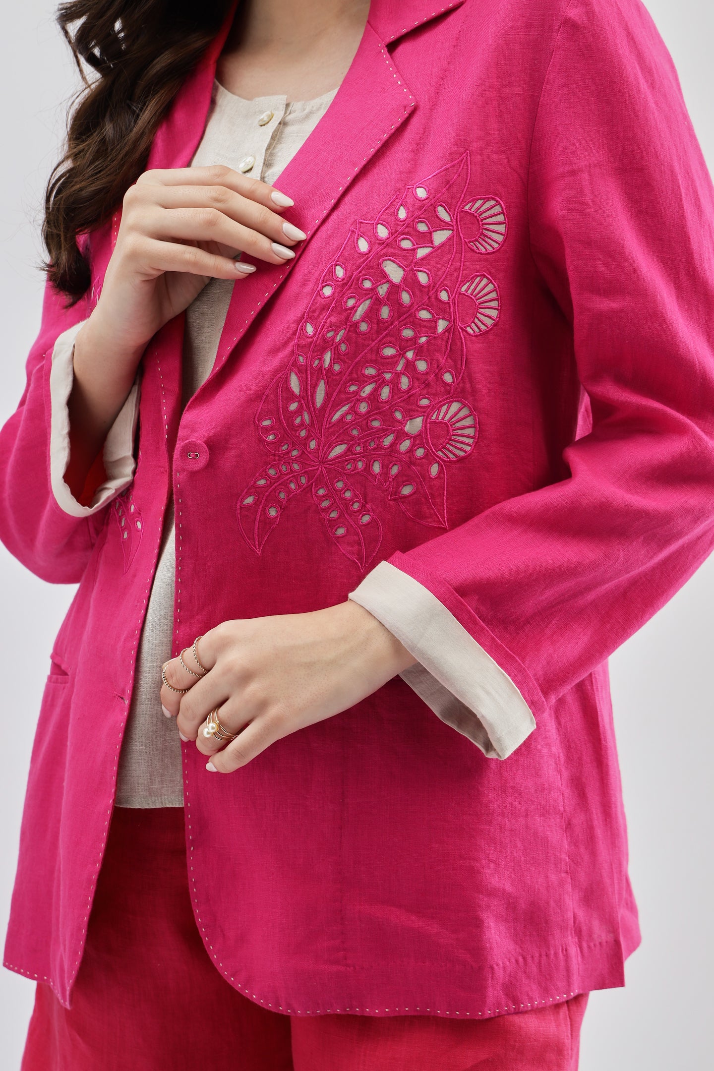 Fuschia Blazer crafted from linen fabric, featuring delicate cutwork at the bottom for a modern, stylish twist on a classic design.