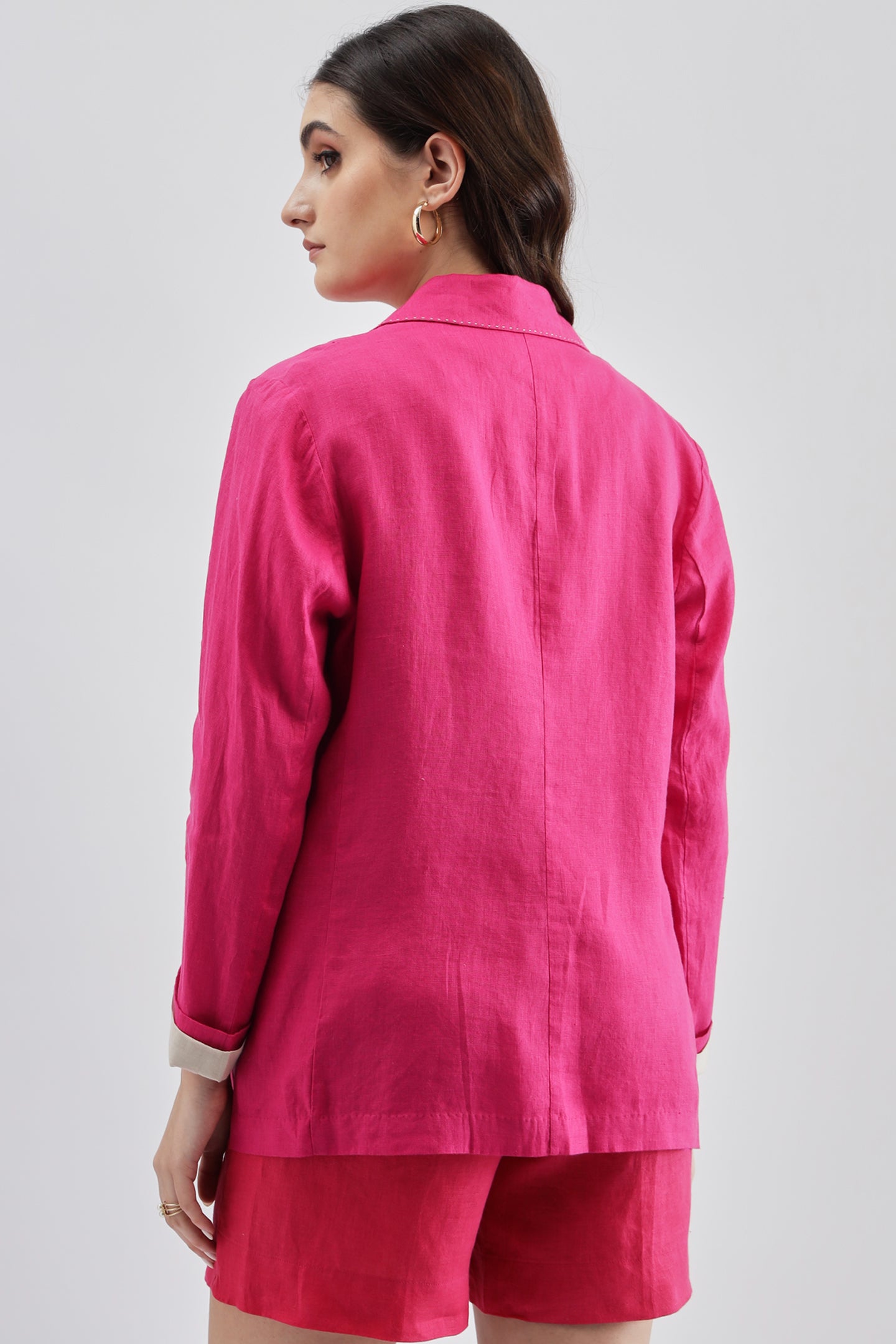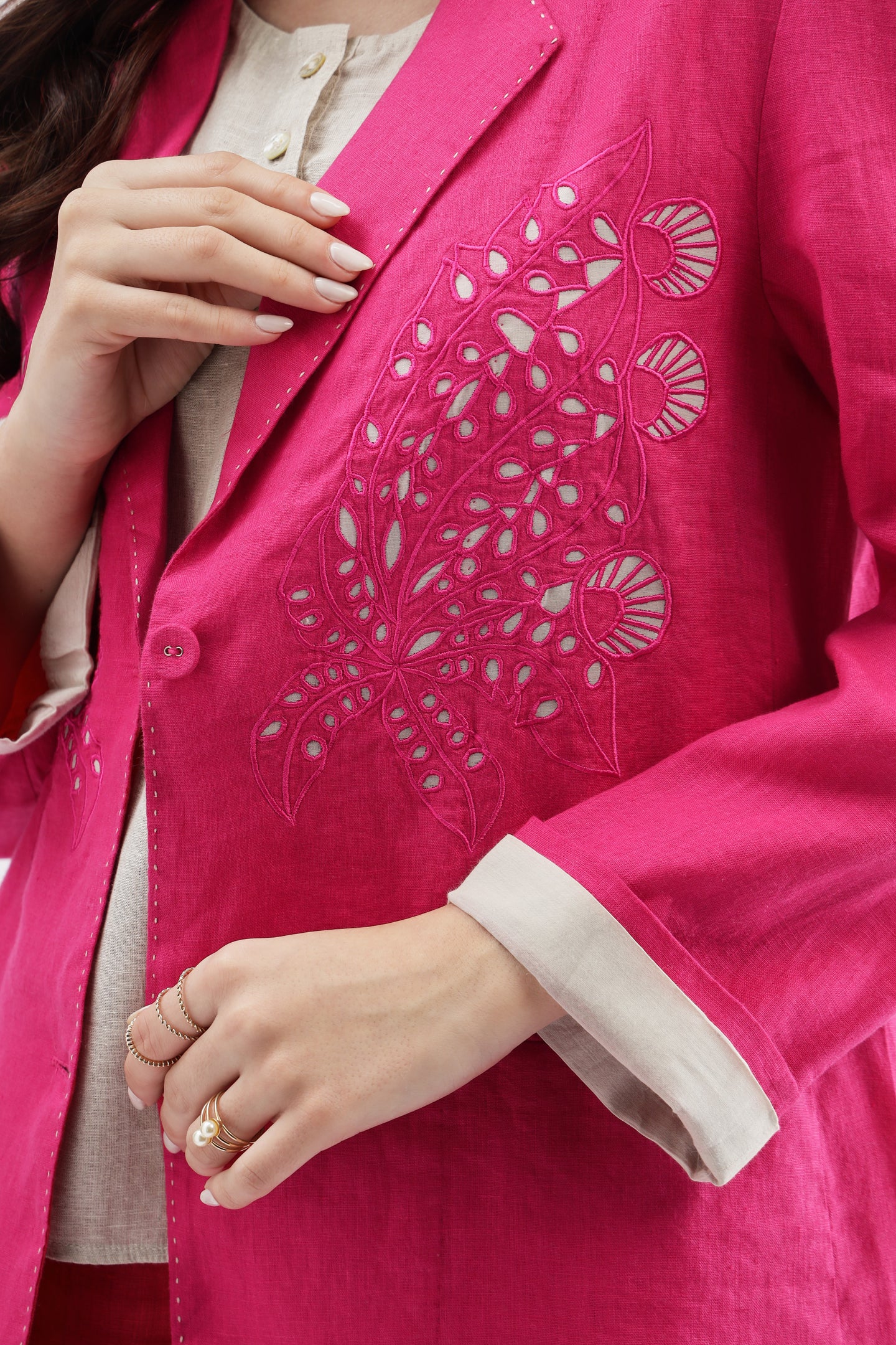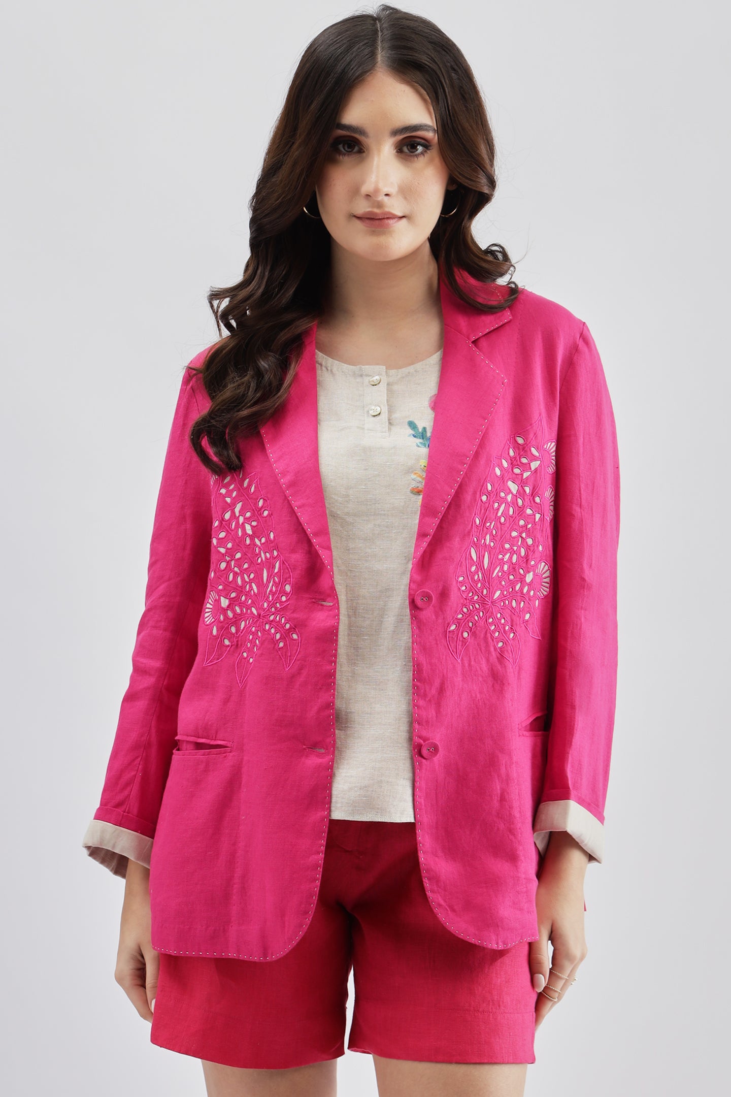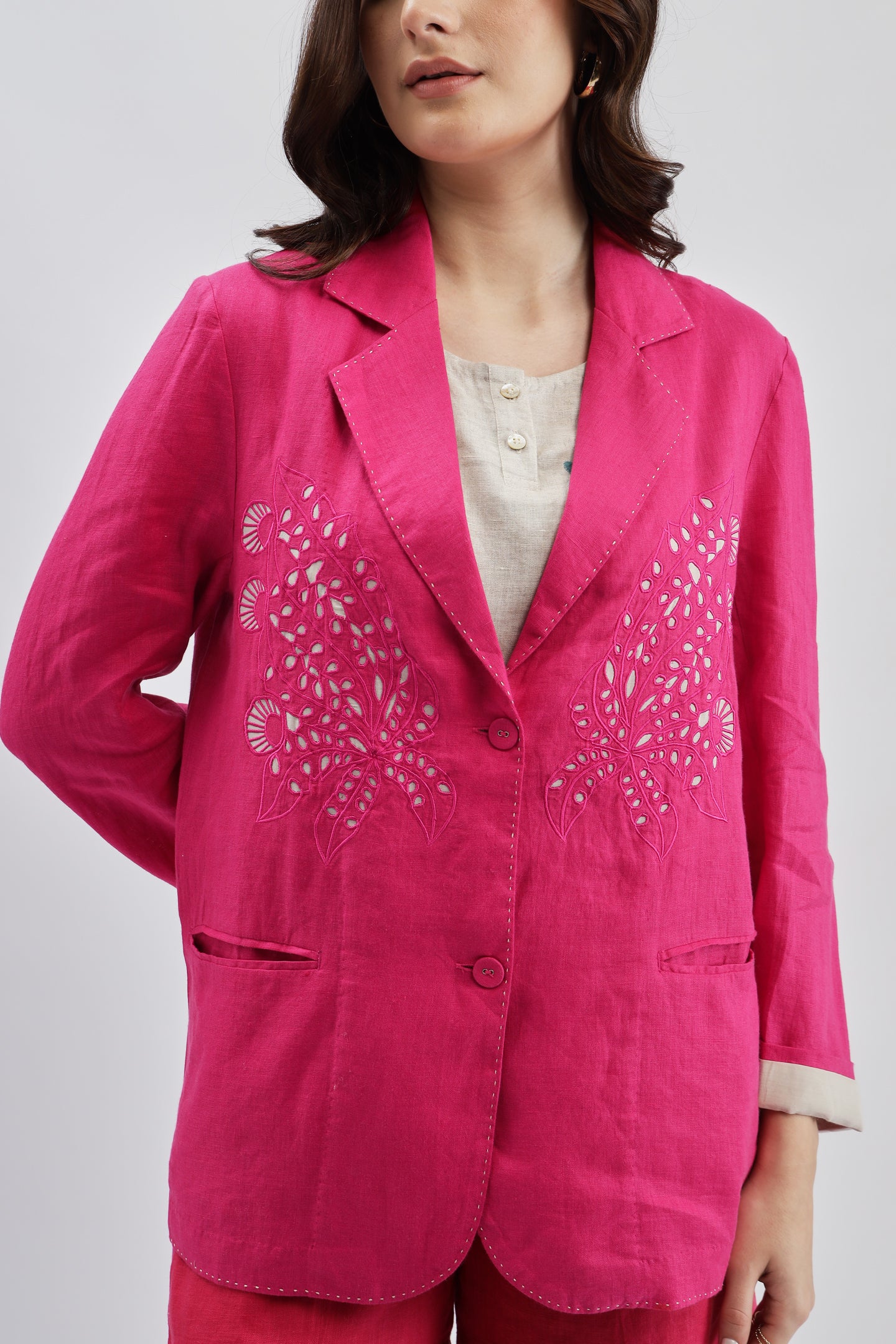 Fuschia Blazer crafted from linen fabric, featuring delicate cutwork at the bottom for a modern, stylish twist on a classic design.