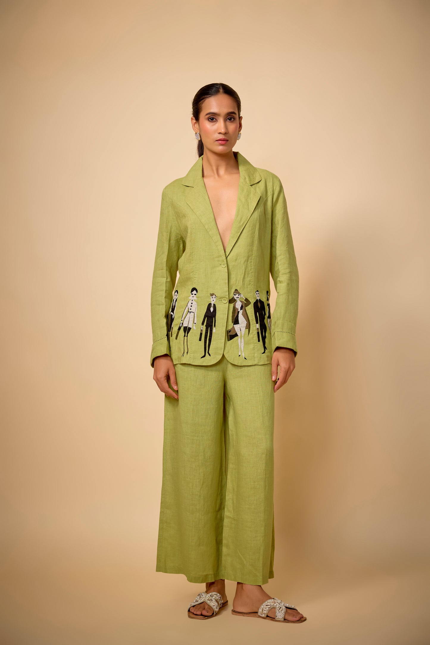Pure Linen Pista Green Doodle Embroidered Blazer Crafted From 100% Pure Irish Linen, Combining Lightweight Comfort With Artistic Detailing. The Playful Doodle Embroidery On A Soft Pista Green Base Adds A Modern, Creative Touch, Making This Blazer Perfect For Stylish Layering, Smart-Casual Events, And Standout Summer Outfits.