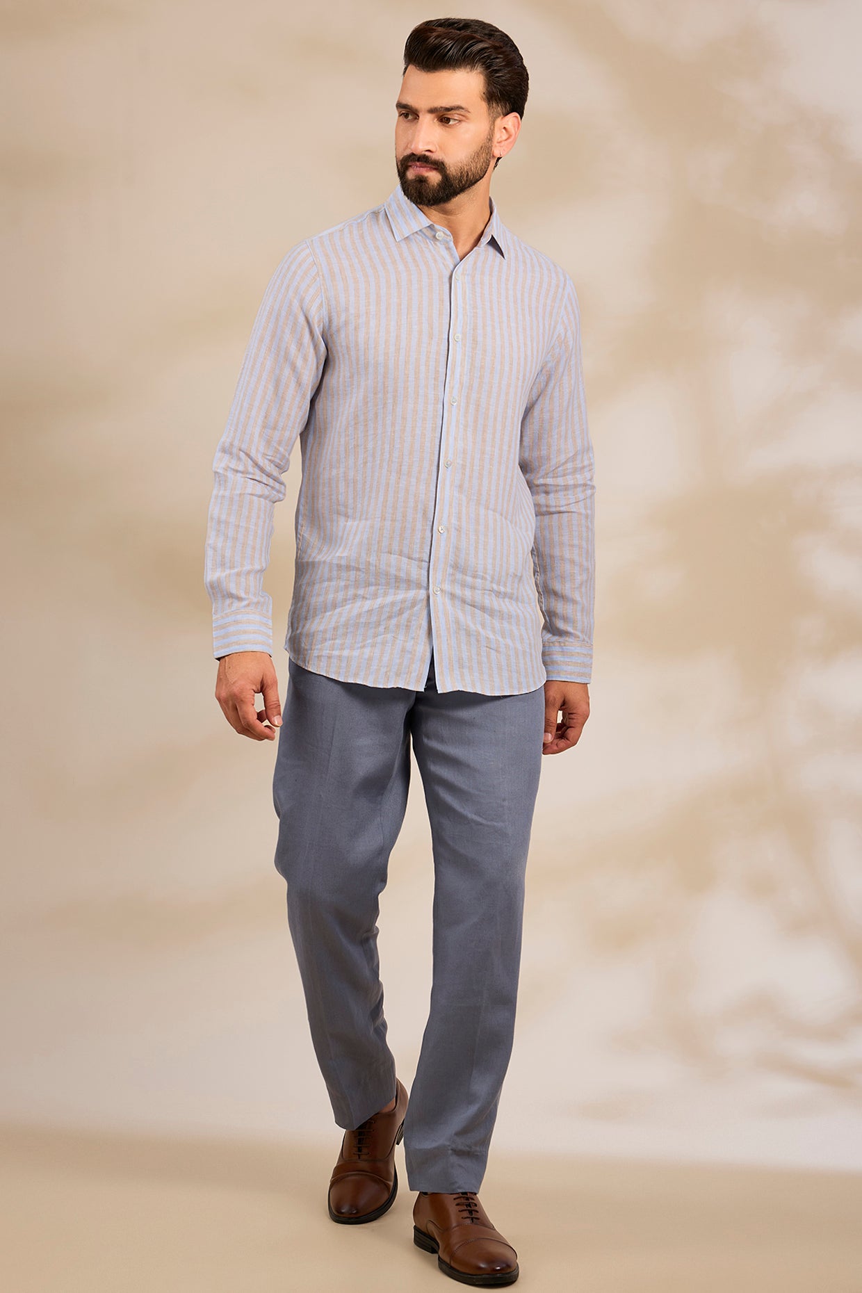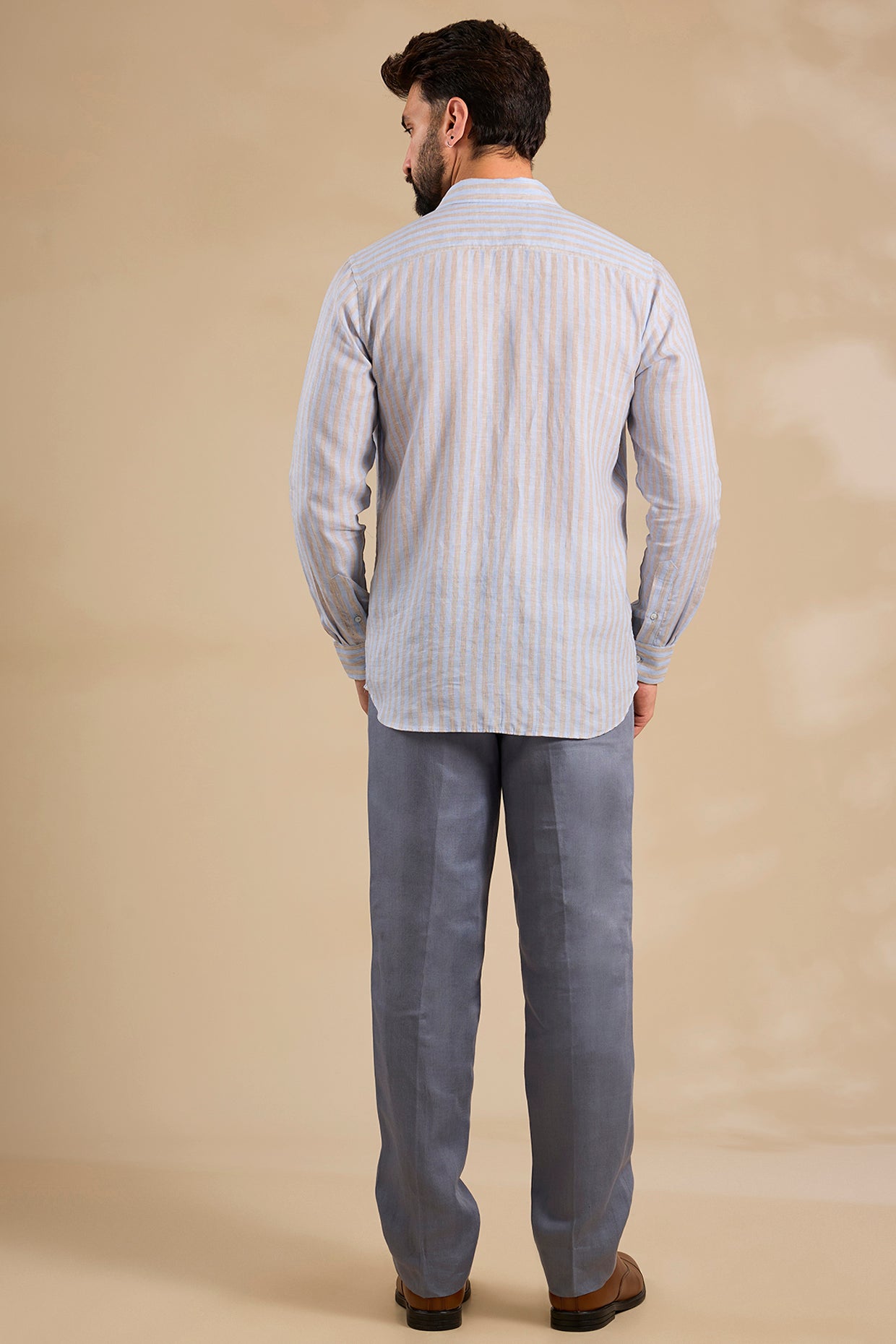 Pure Irish Linen Men'S Classic Blue Khakhi Stripe Shirt
