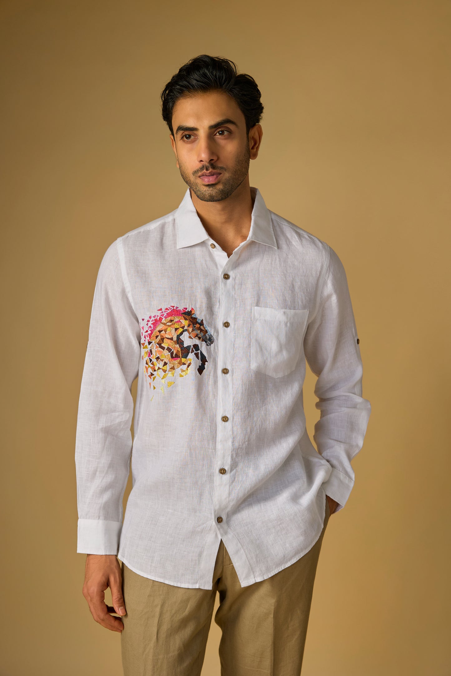 Pure Linen White Abstrach Horse Embroidered Shirt