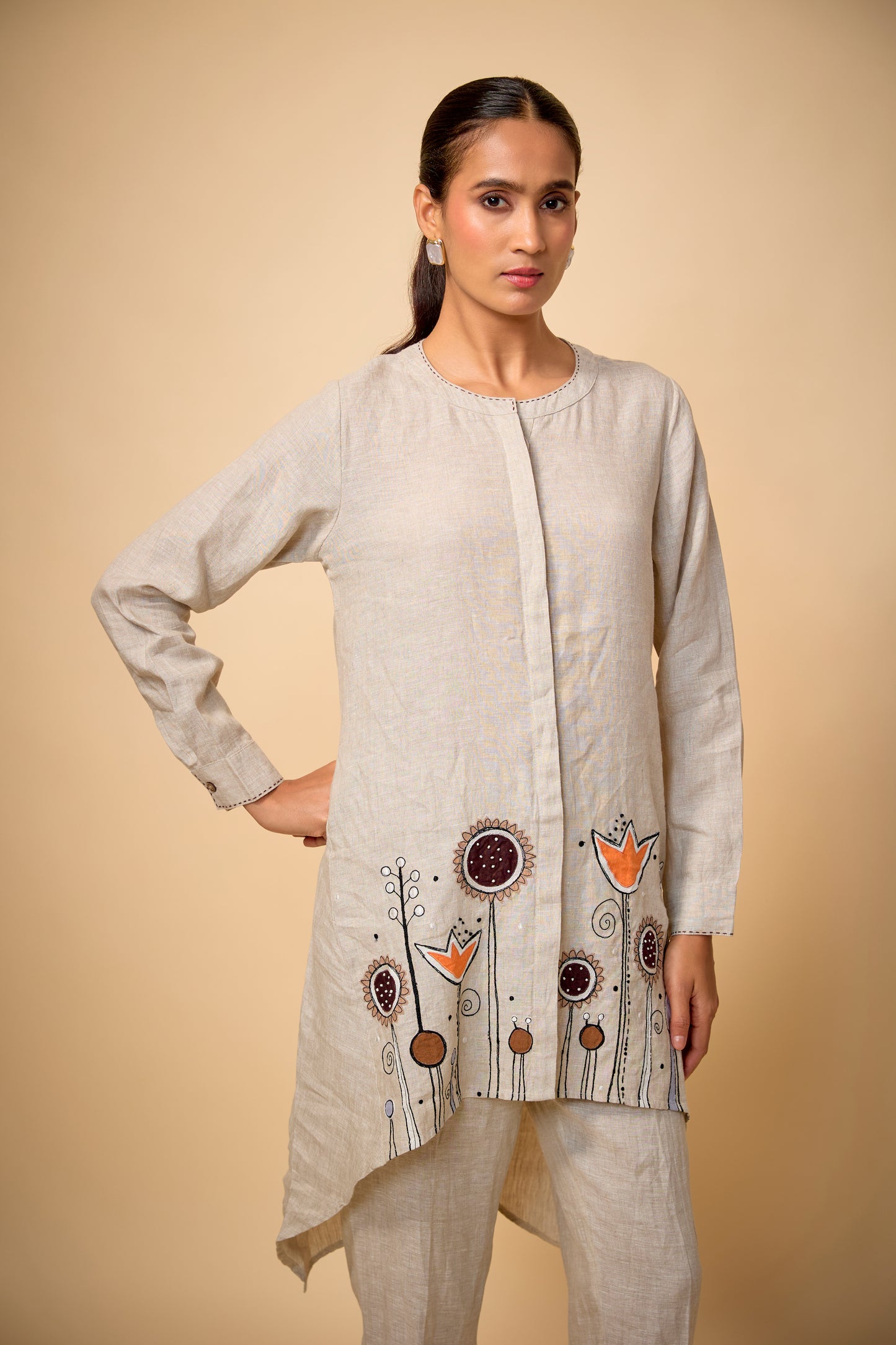 Pure Linen Beige Floral Highlow Embroidered Tunic Set