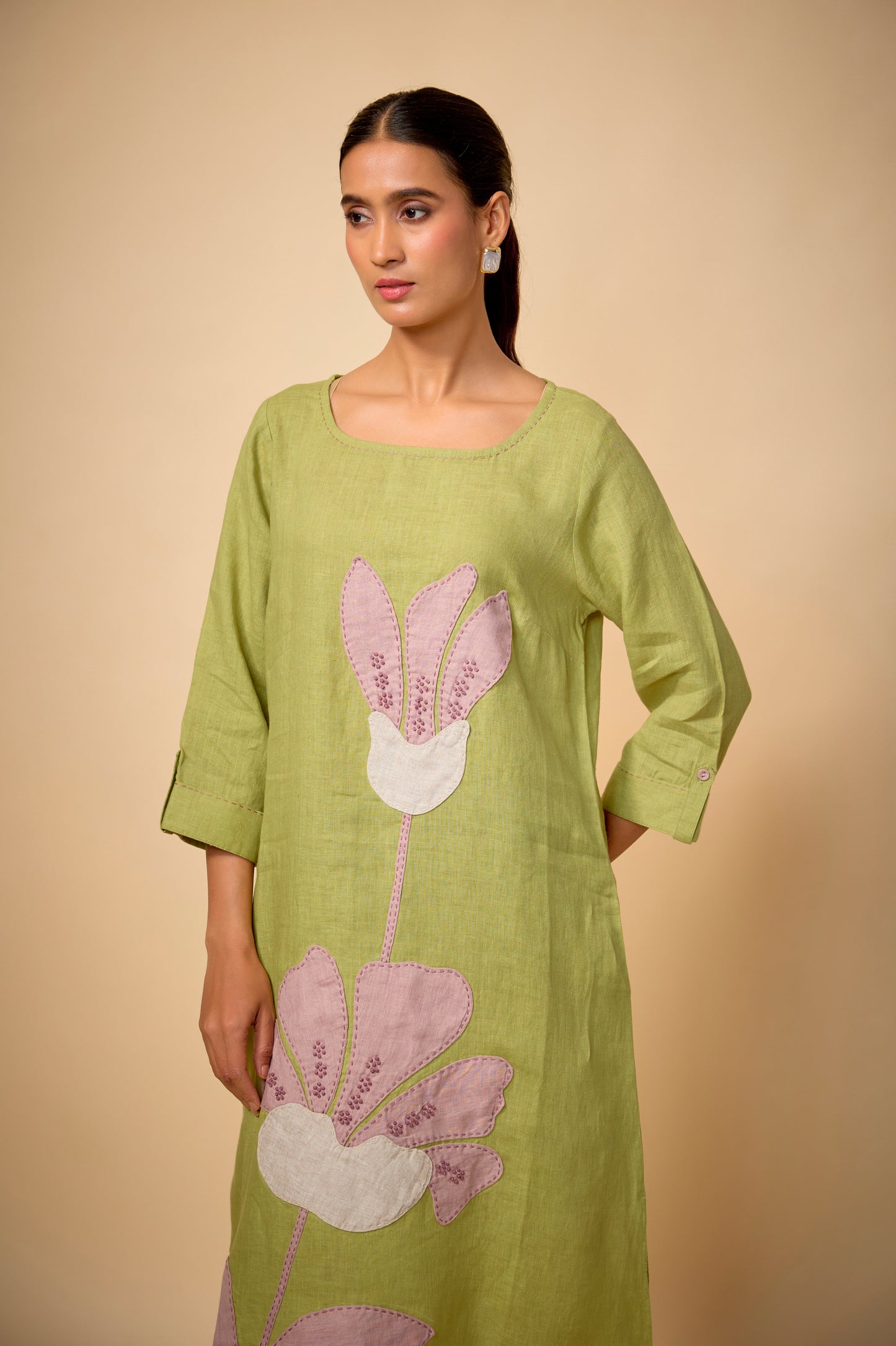 Pure Linen Pista Green Pink Floral Embroidered Dress