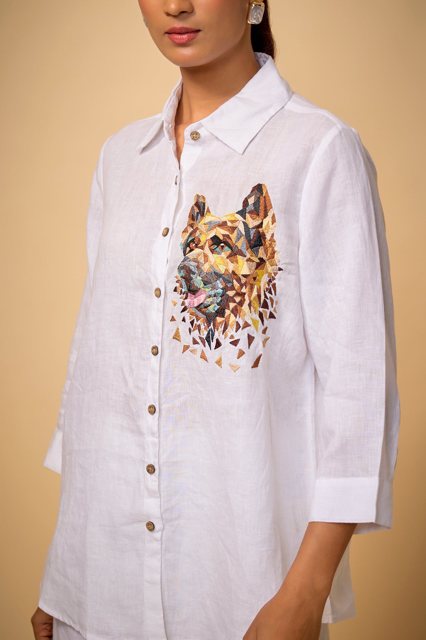 Pure Linen White Captain Dog Embroidered Shirt