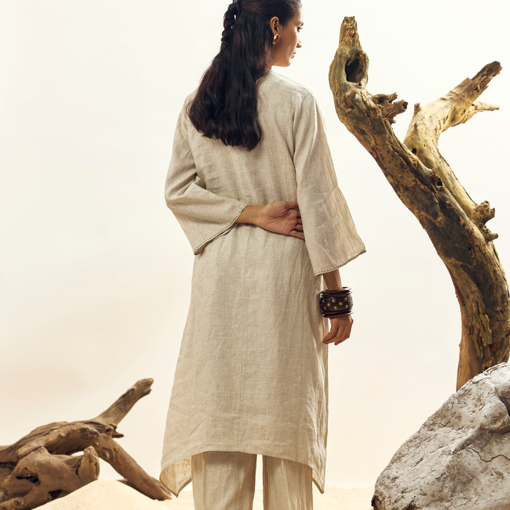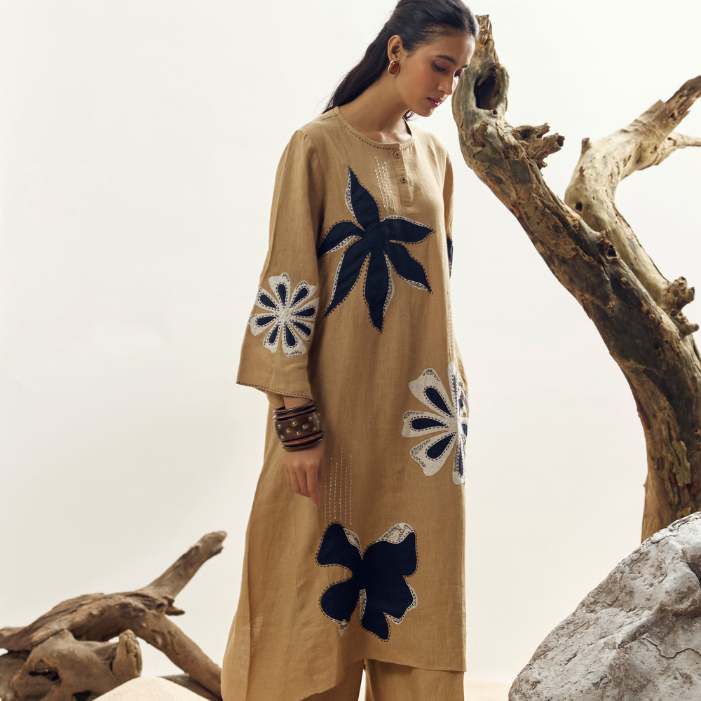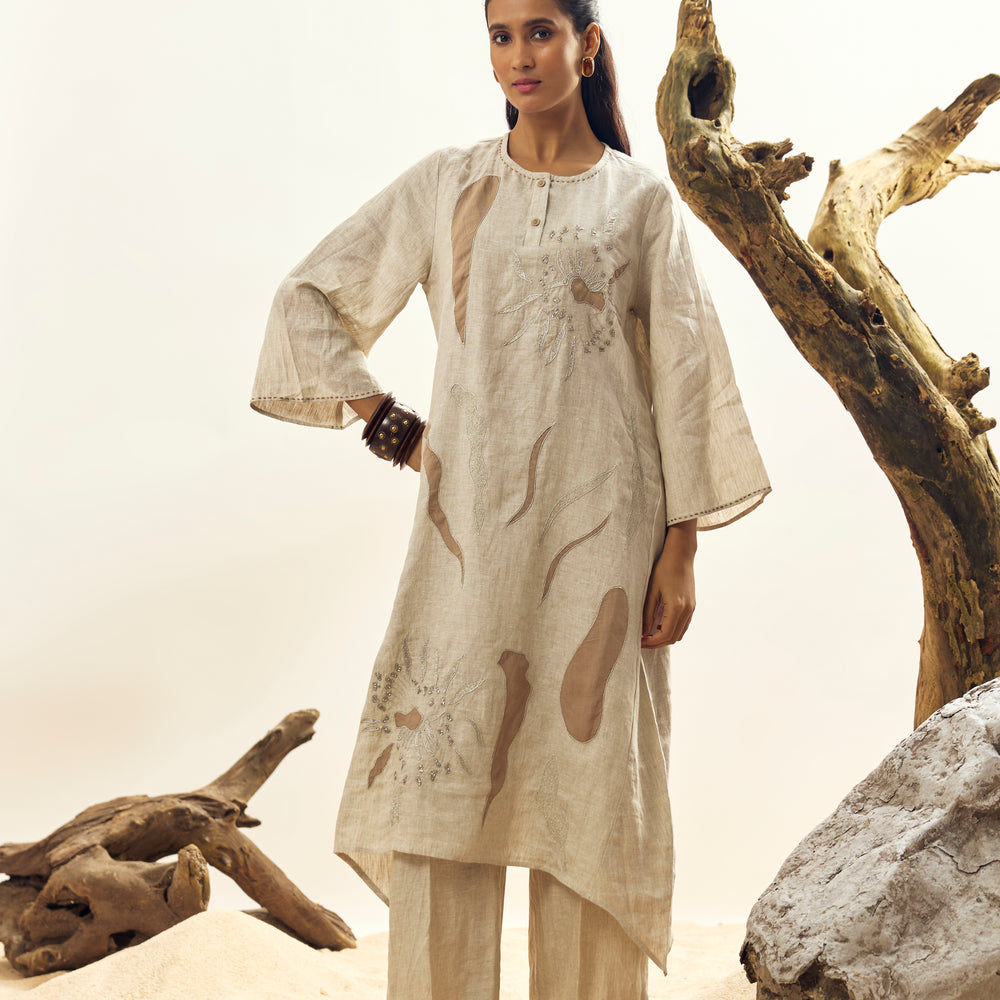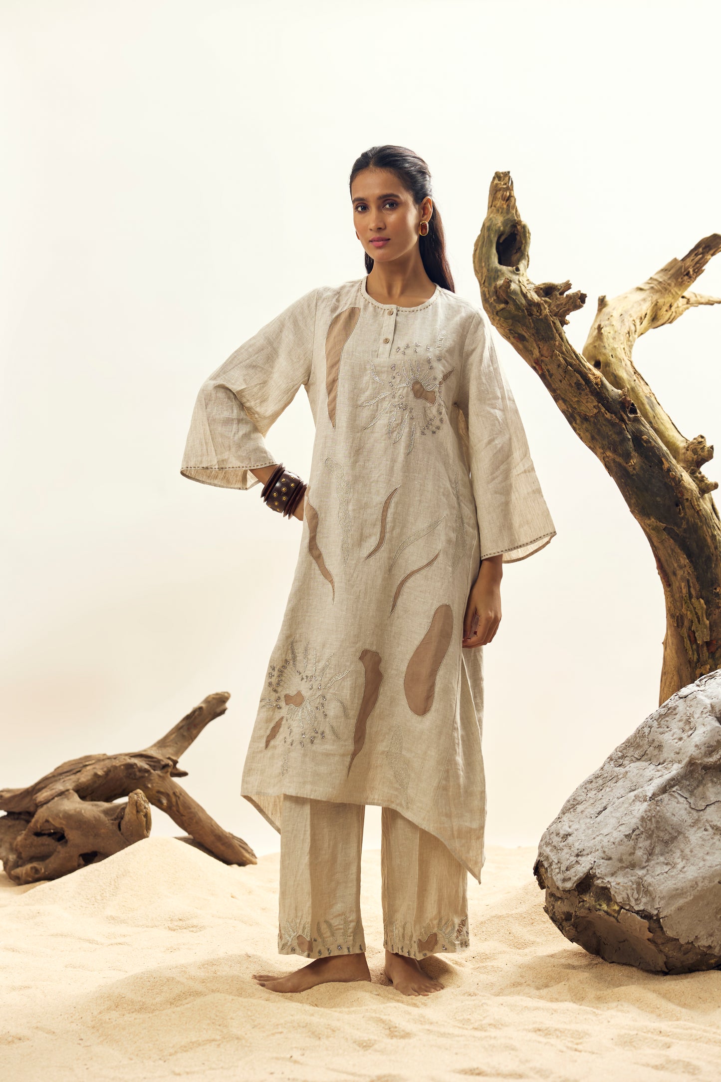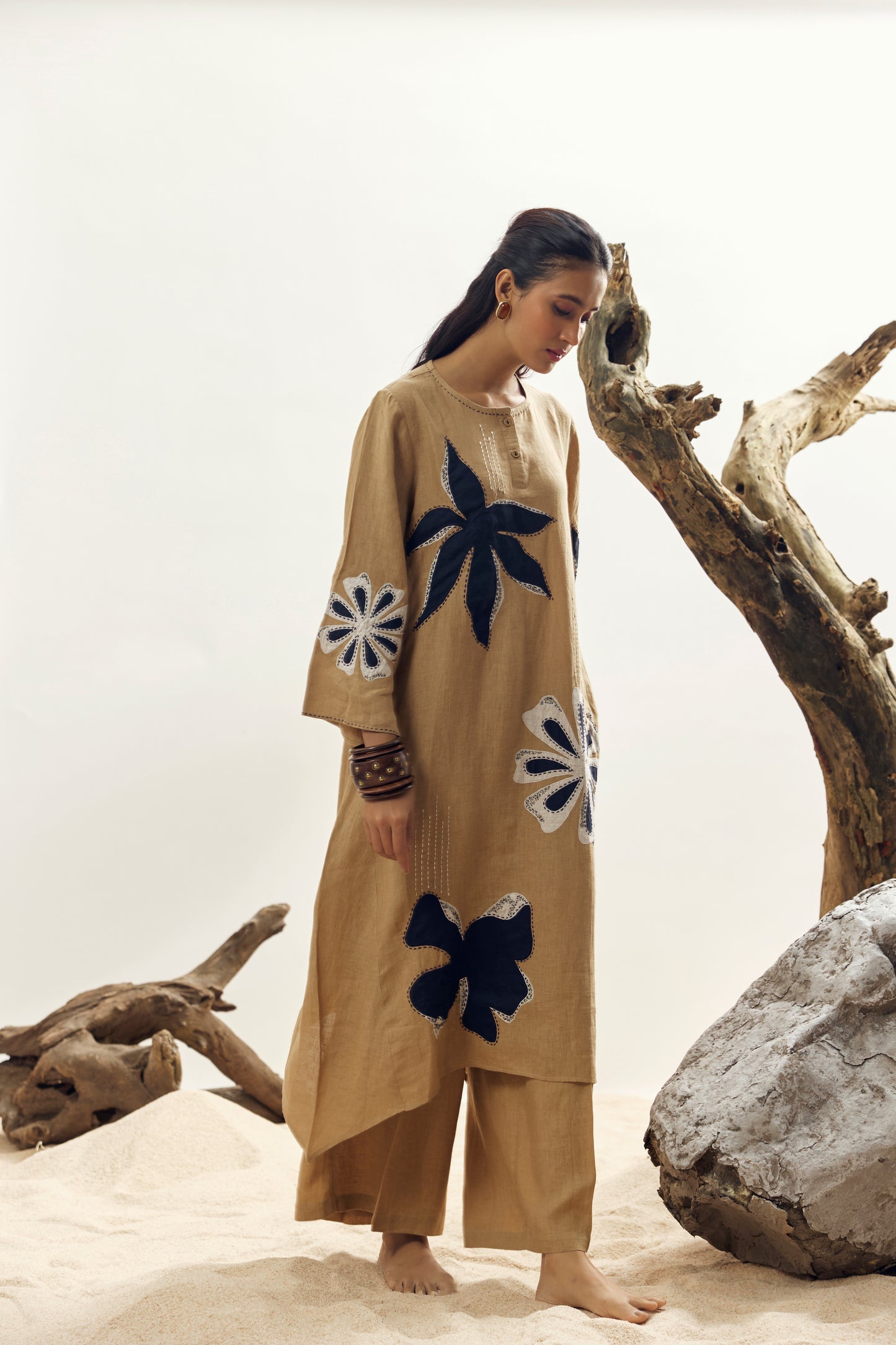 Beige Sequins Work Embroidery Tunic and Pants Set