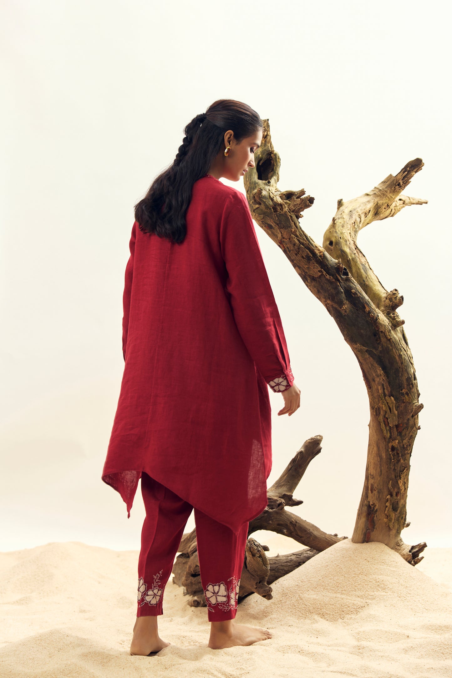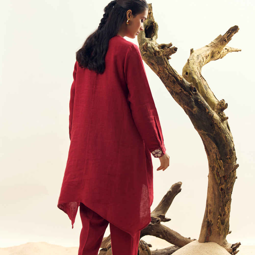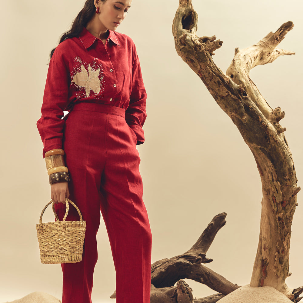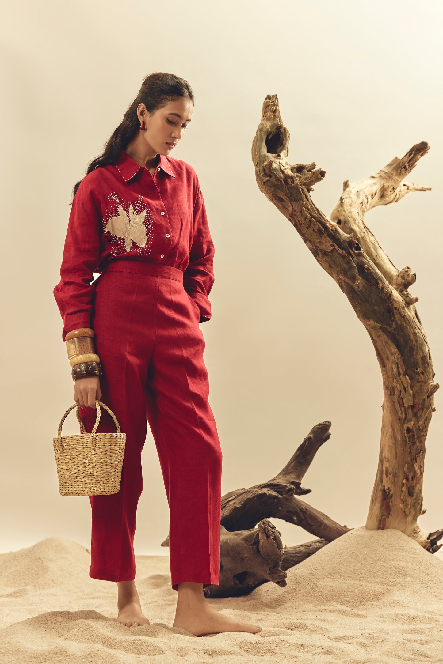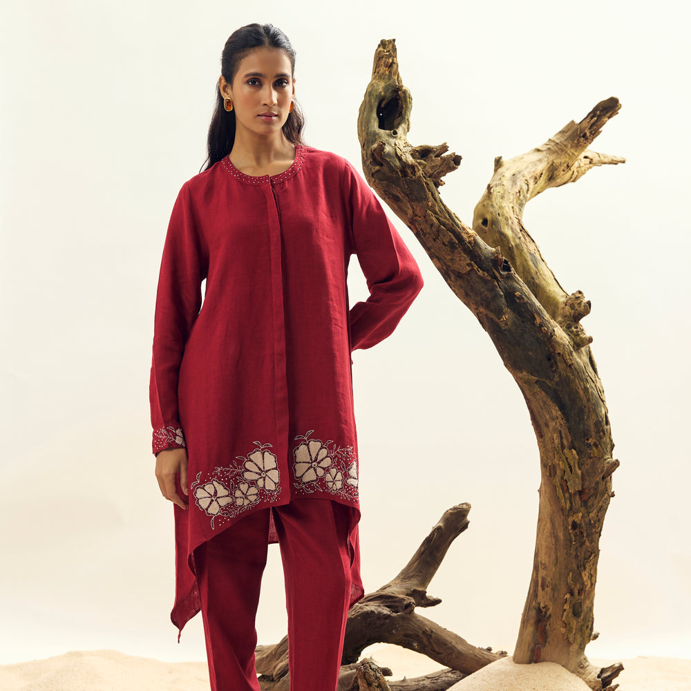 Crimson Two Button Sequin Embroidery Dress and Pants