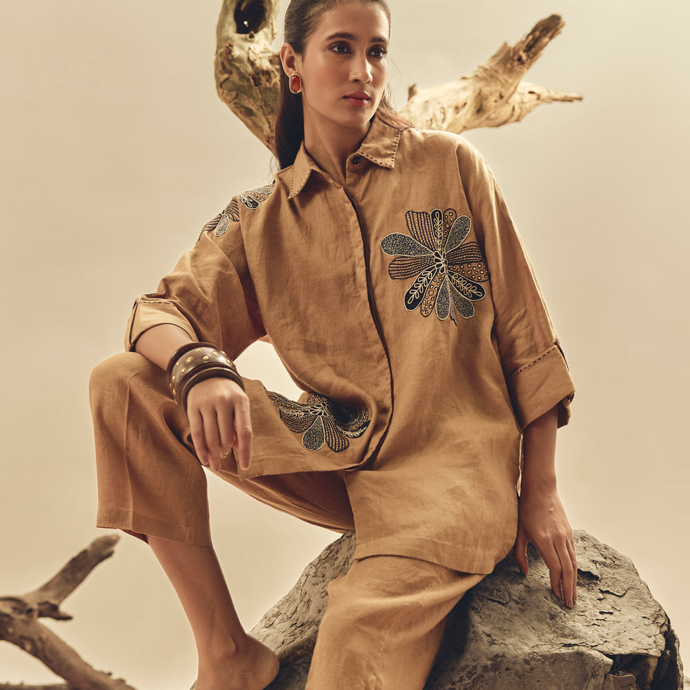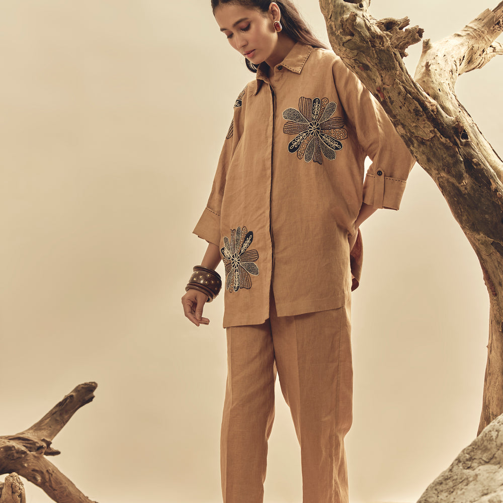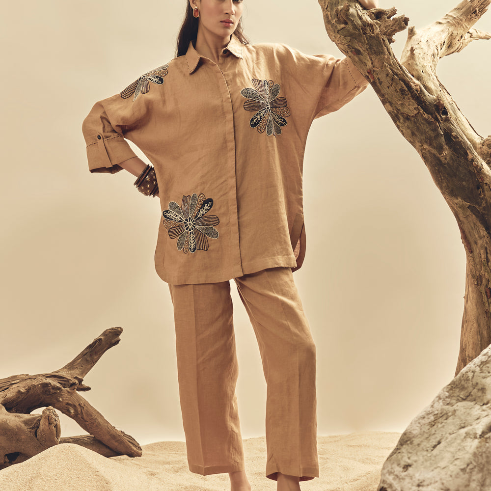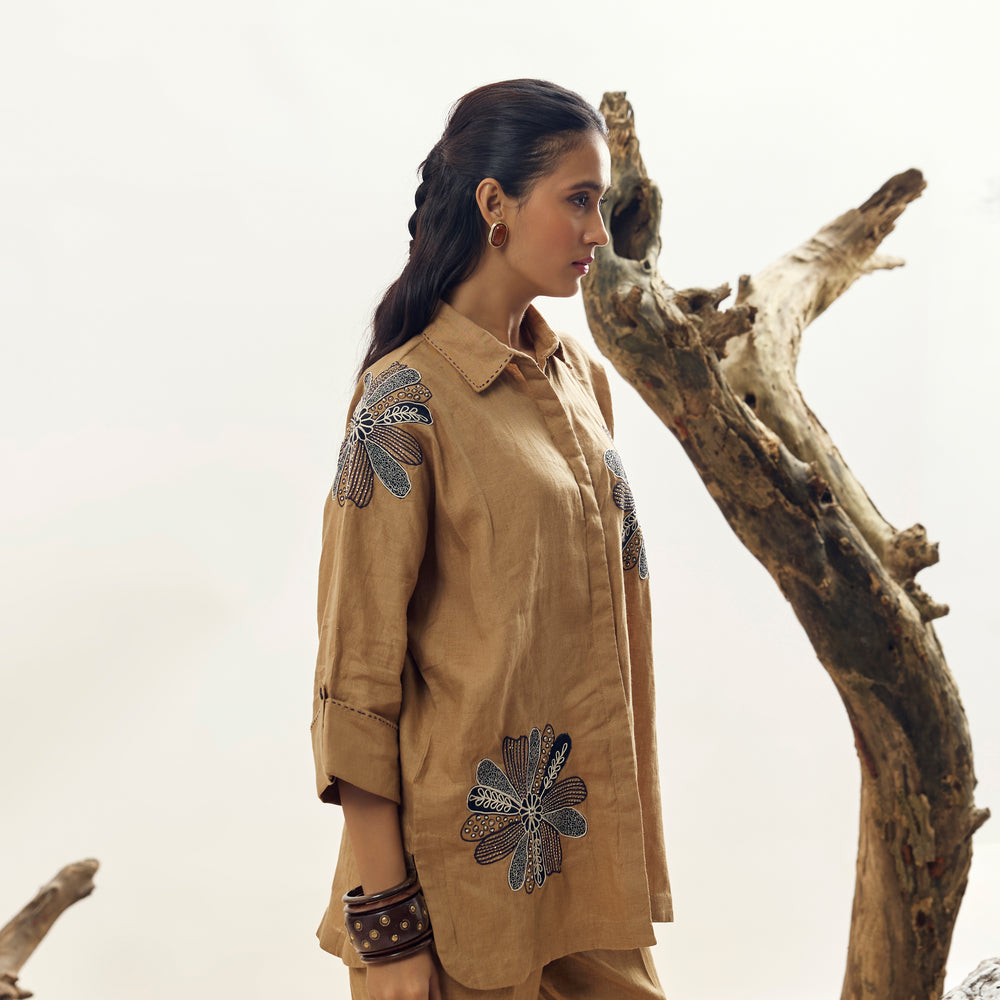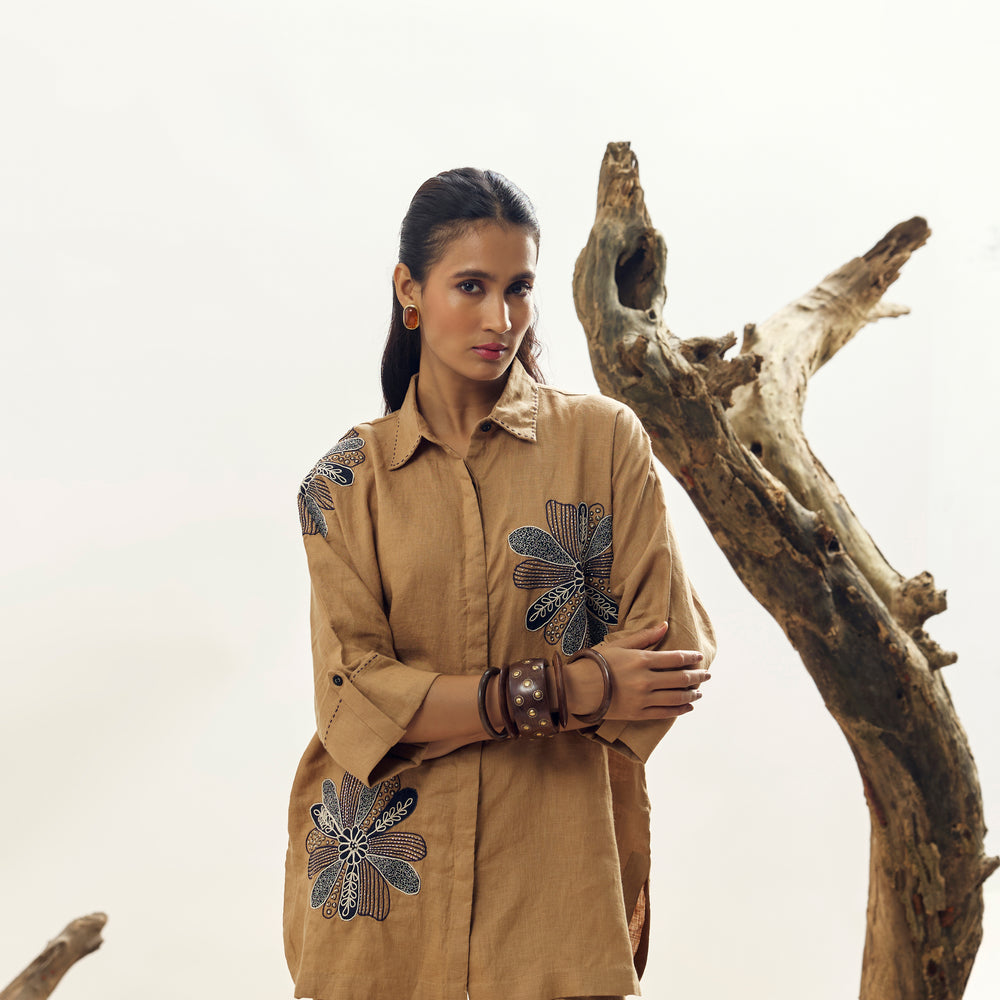 Camel Floral Dori Embroidered Big Shirt