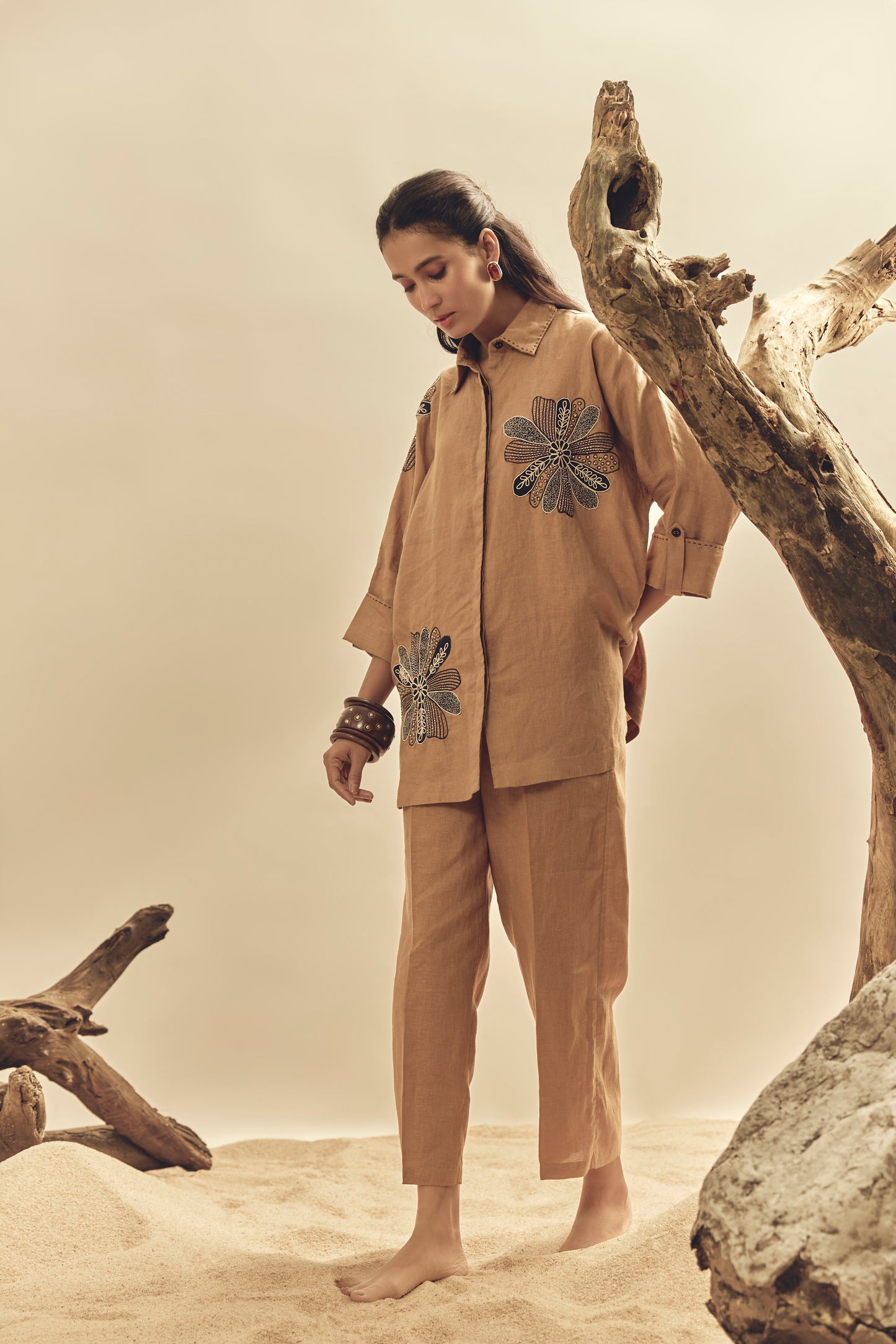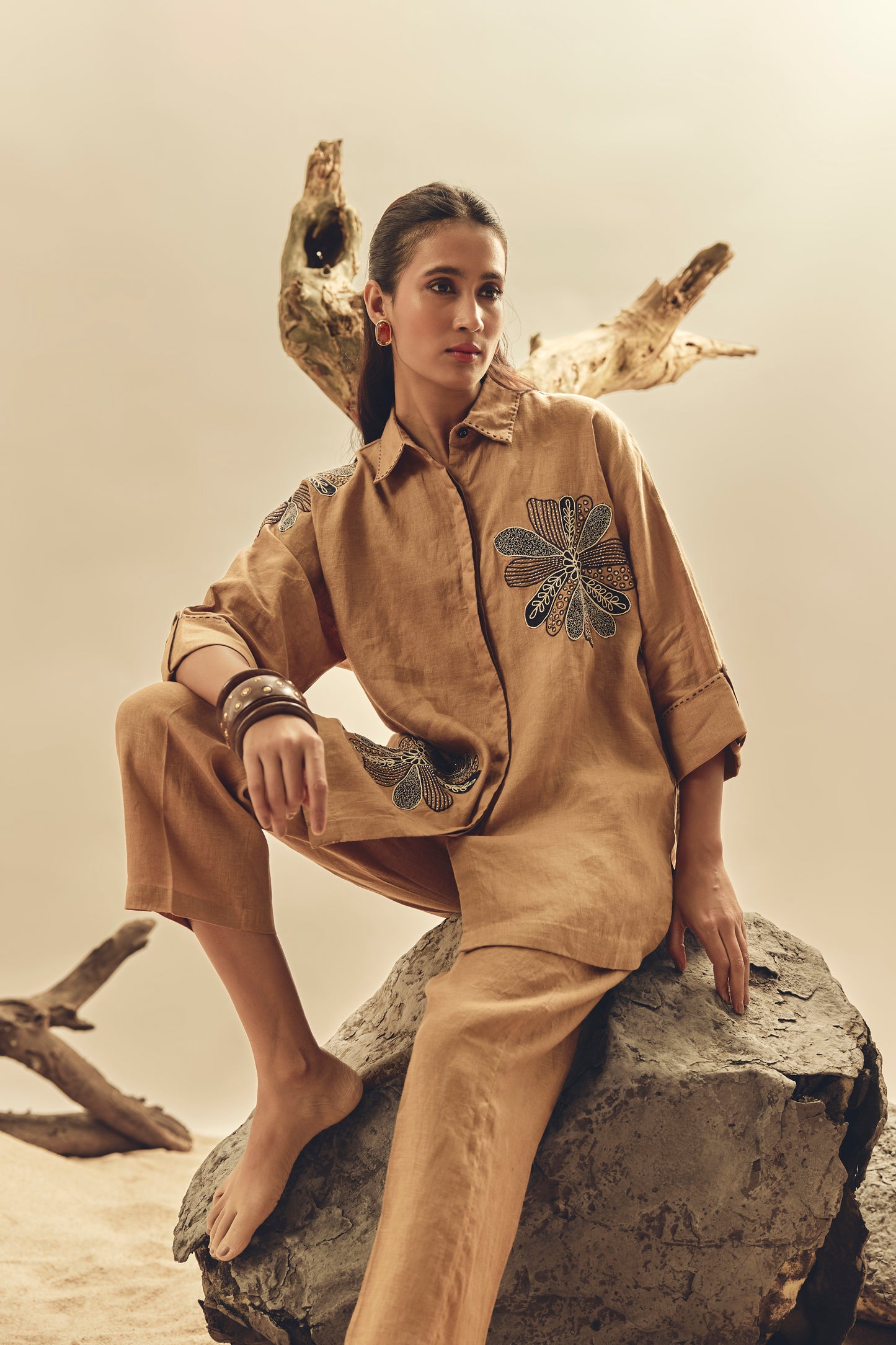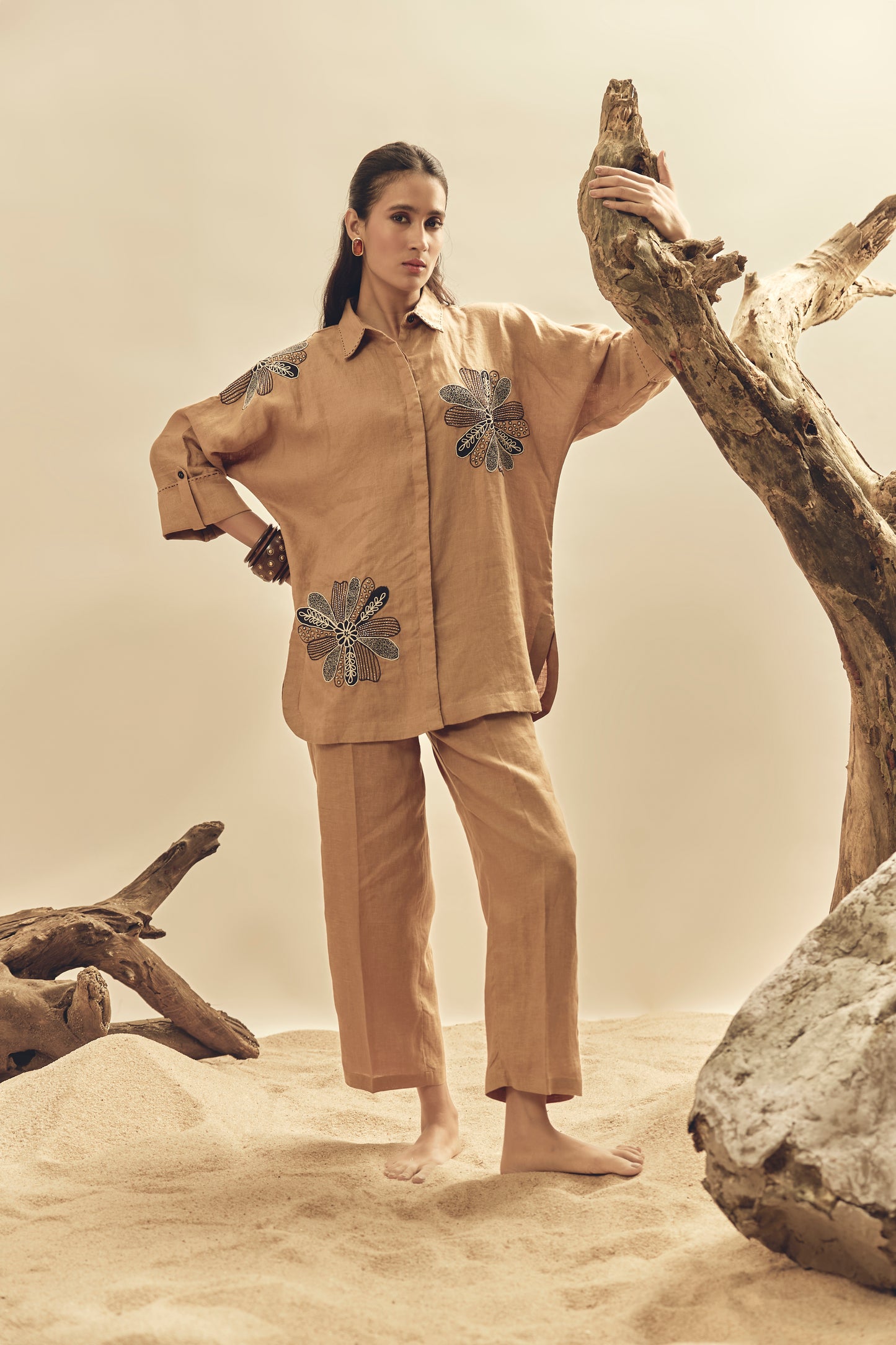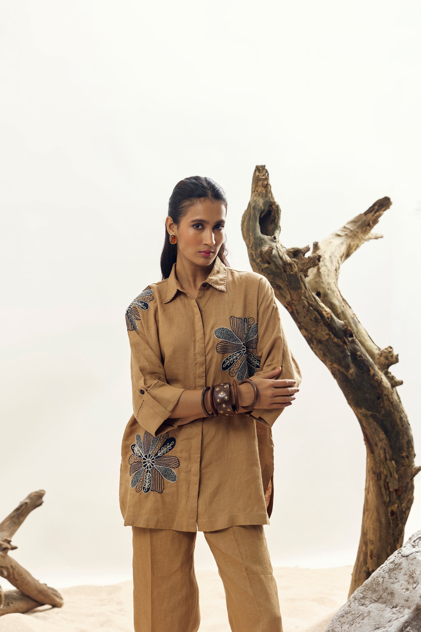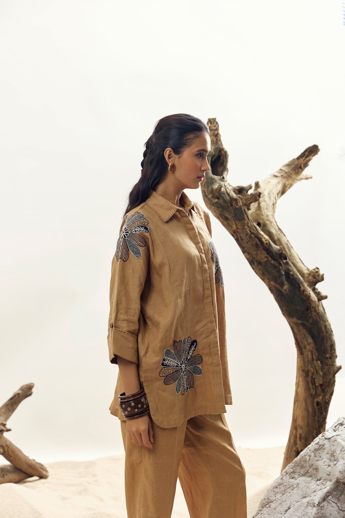 Camel Floral Dori Embroidered Big Shirt