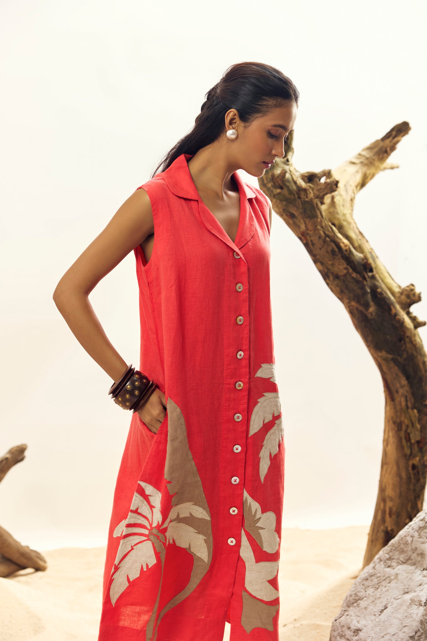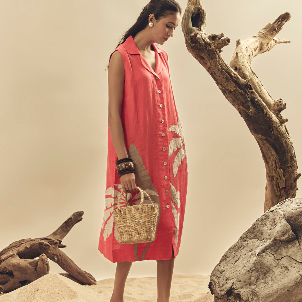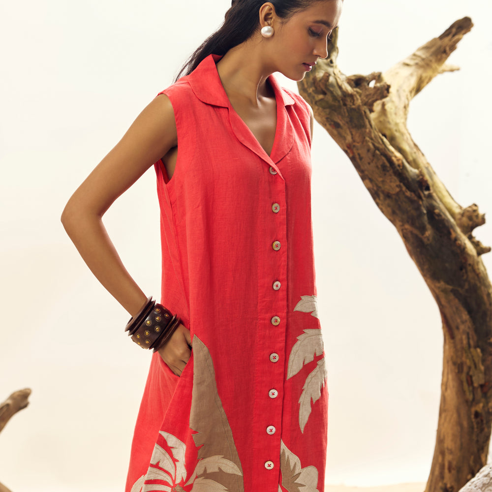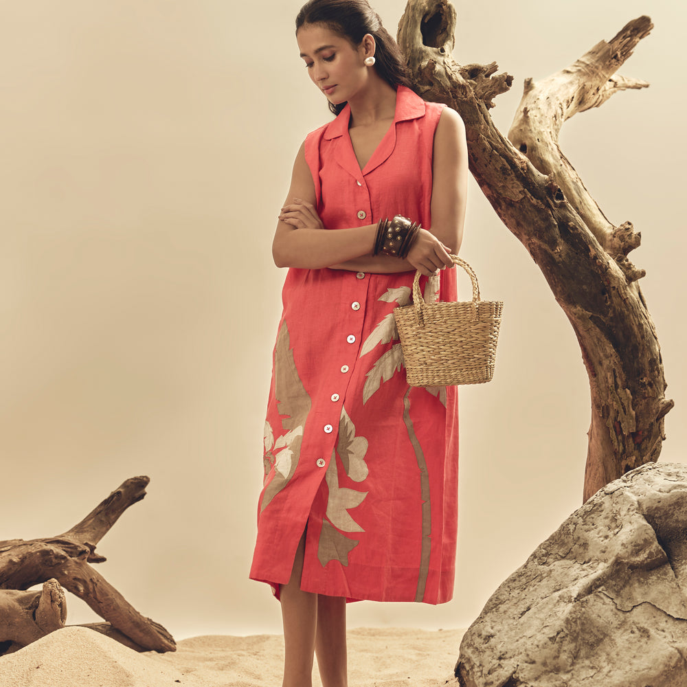 Feel fresh and elegant in this Coral Sleeveless Embroidered Dress, crafted from breathable 100% Irish linen. Featuring delicate embroidery and a flattering silhouette, it’s perfect for warm weather and special occasions.