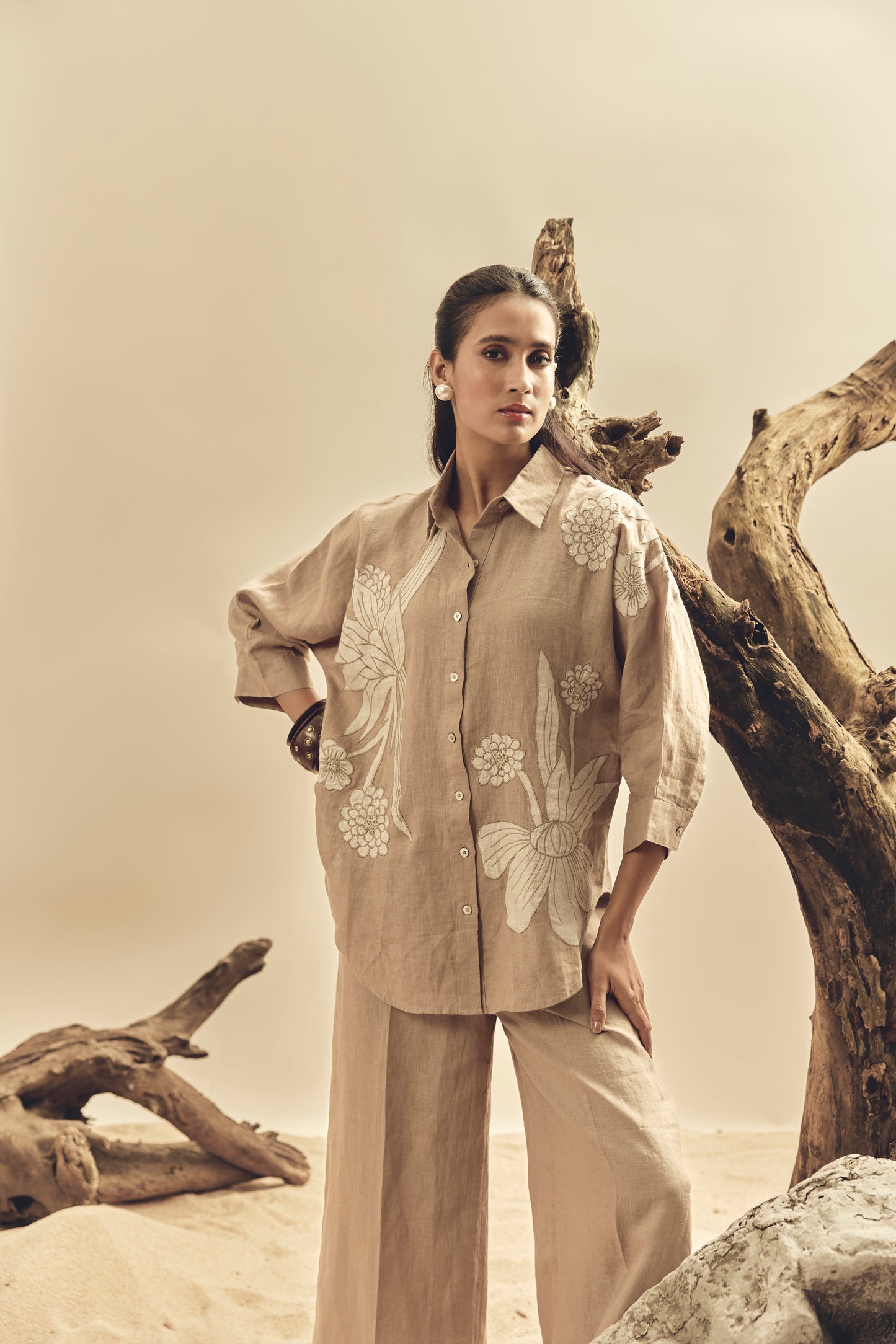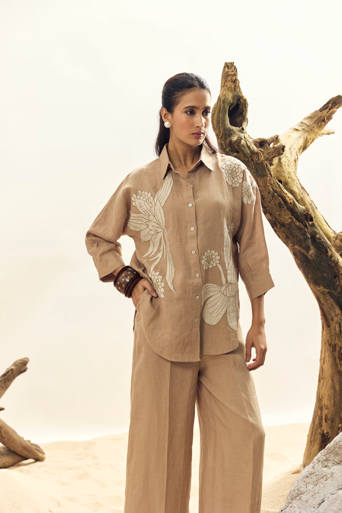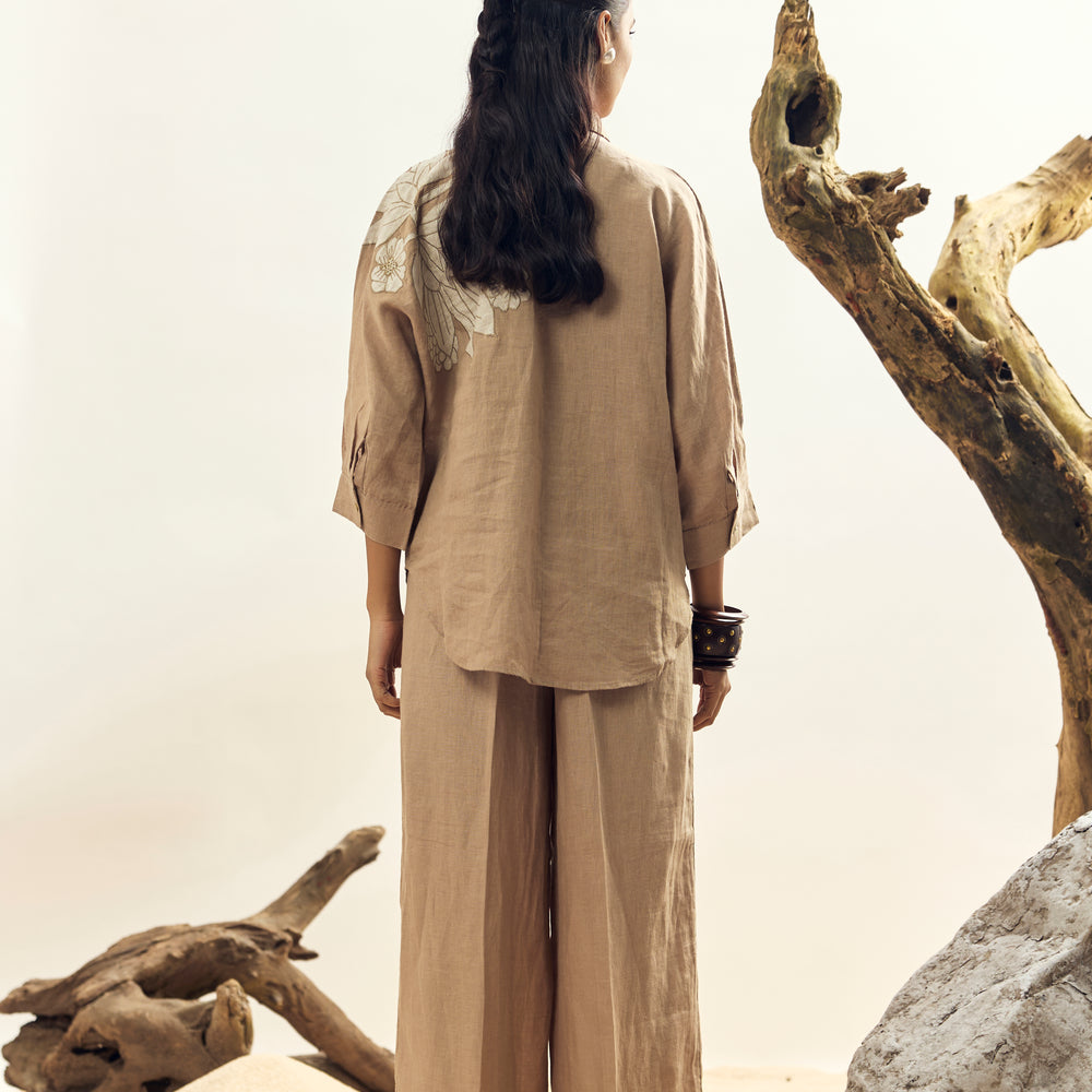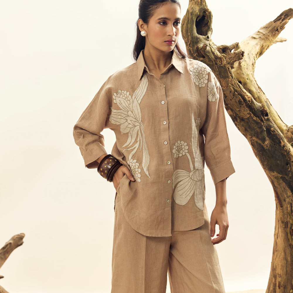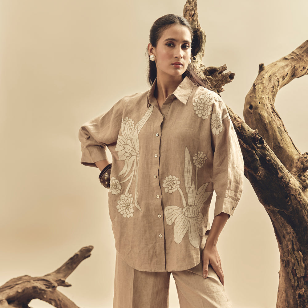 Crafted from 100% premium Irish linen, this khaki shirt features elegant floral appliqué embroidery for a refined, breathable, and feminine look. Perfect for both casual and semi-formal wear.