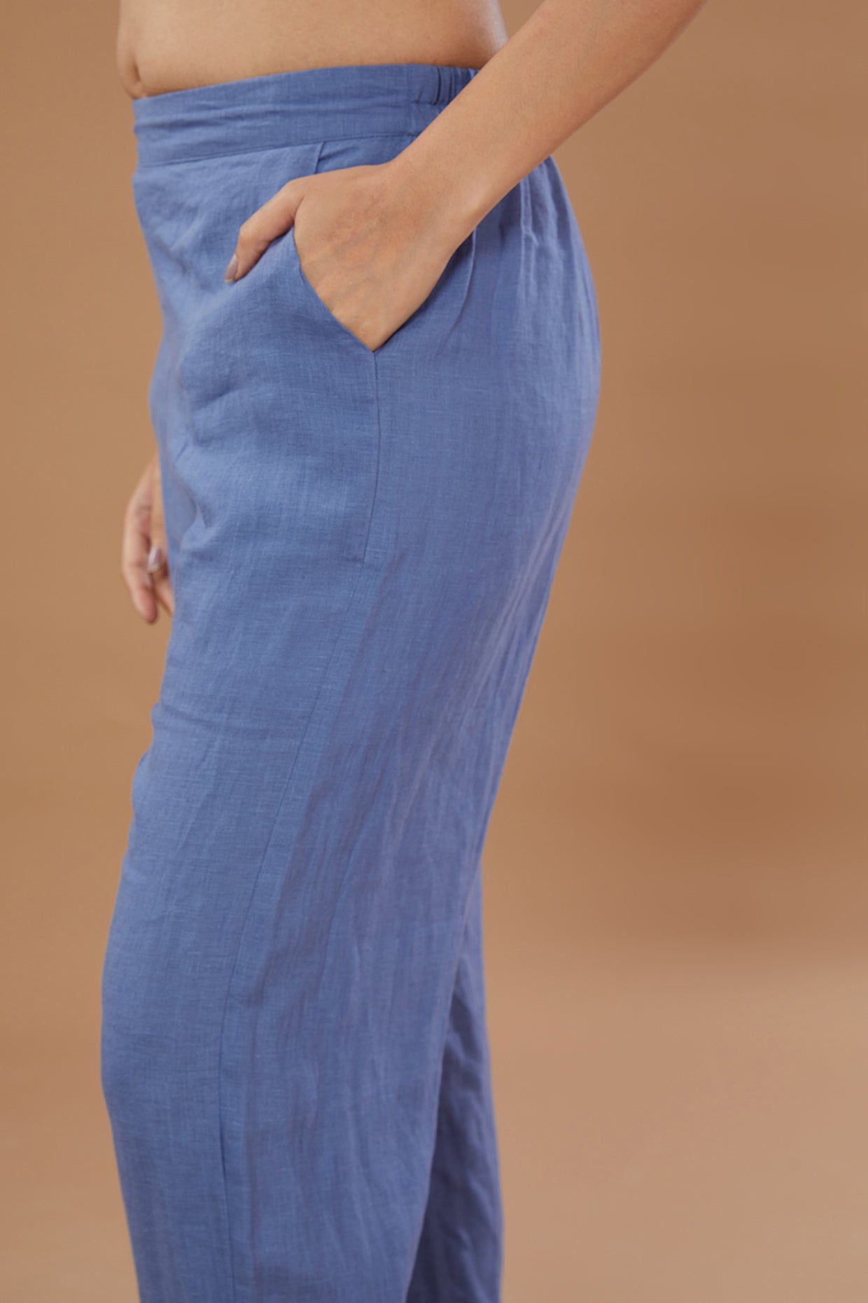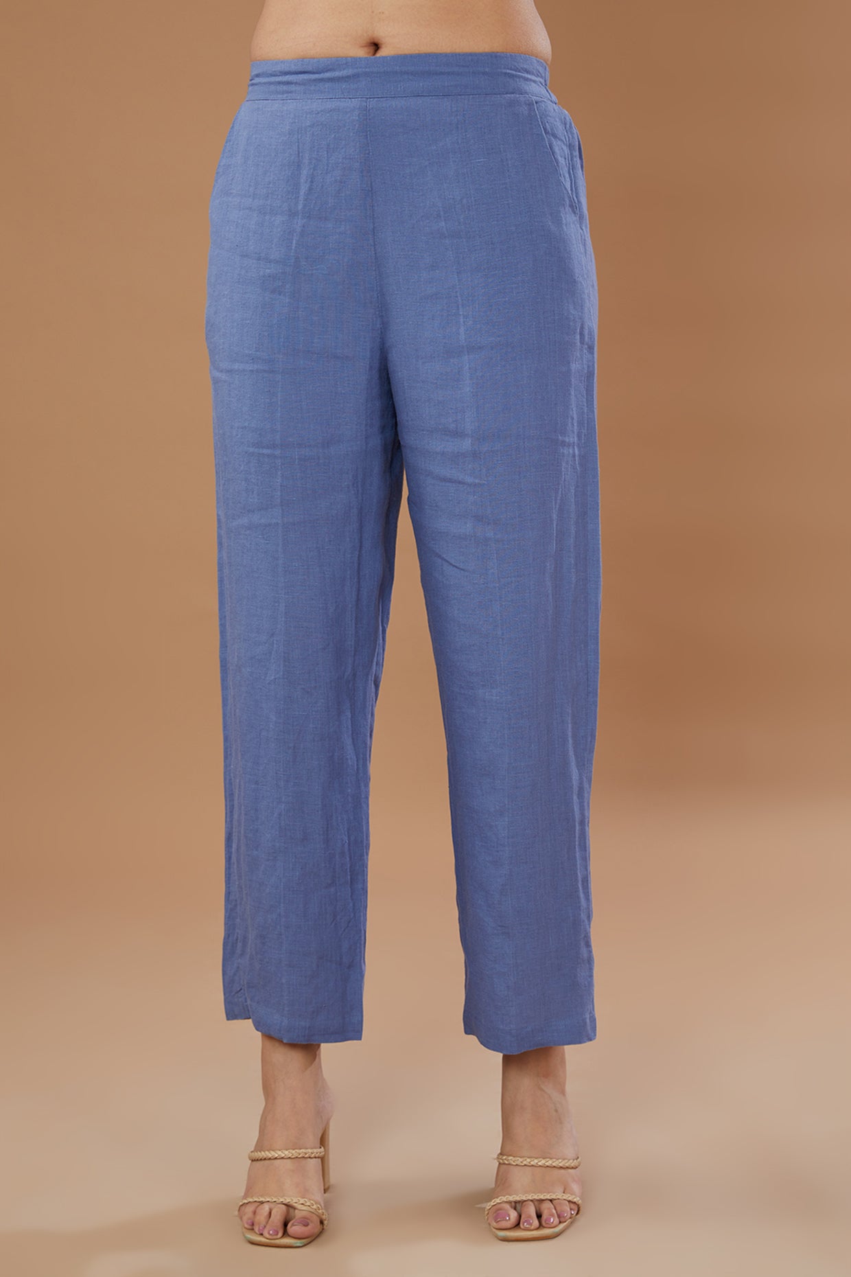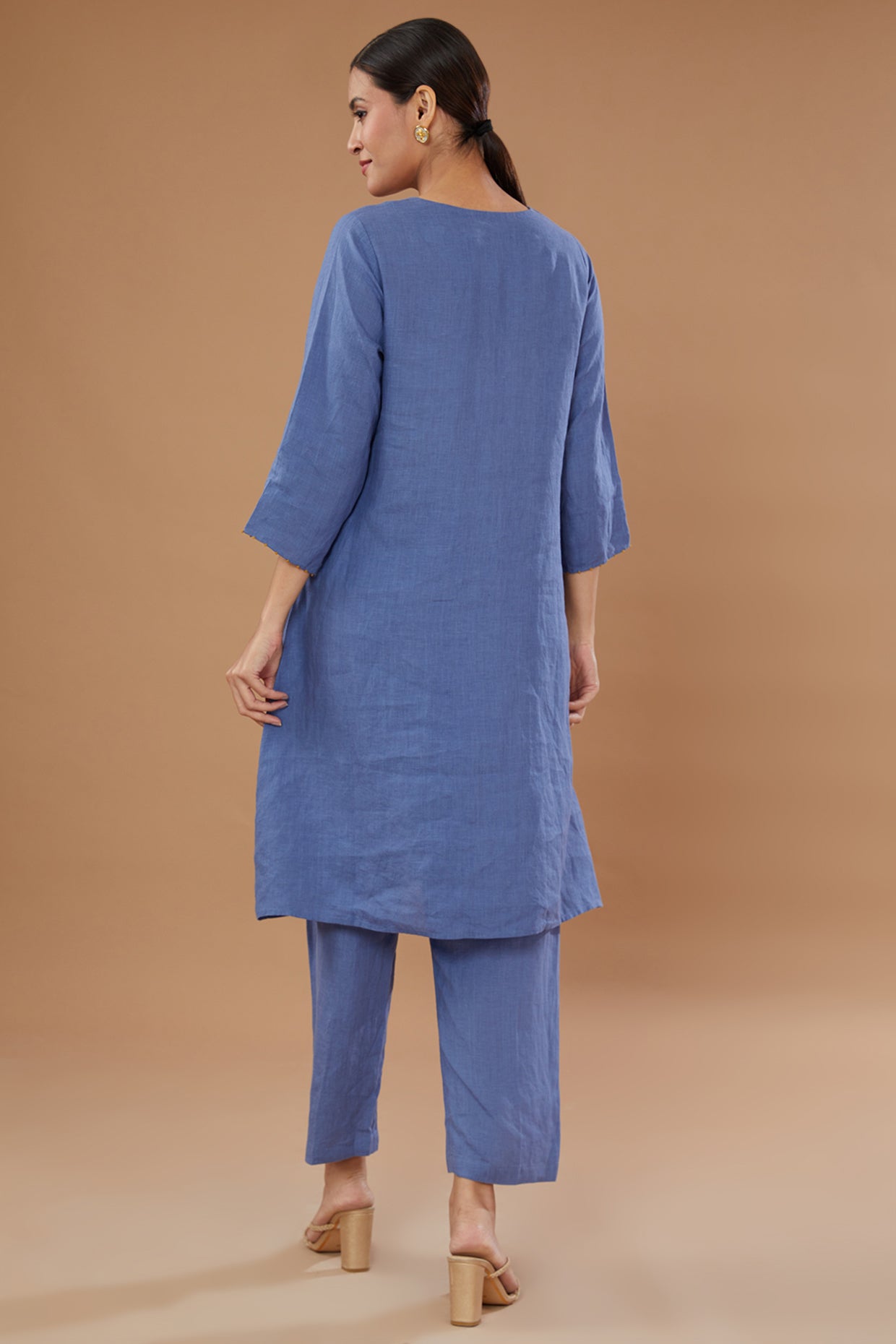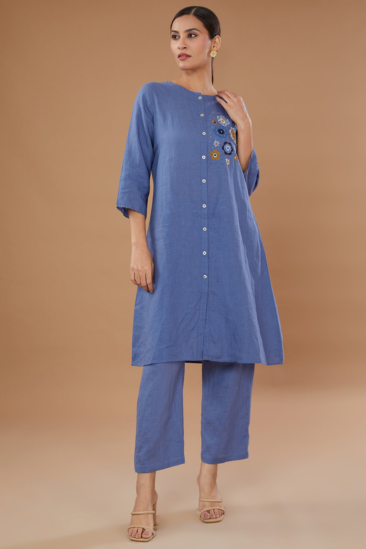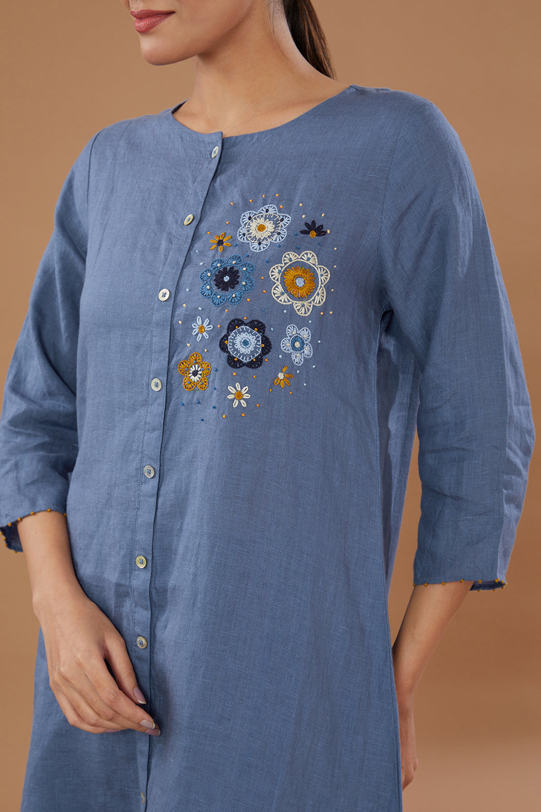 Featuring A Blue Tunic In Pure Linen Base With Floral Hand Embroidery. Accessorise With Dangler Earrings And Heels. Perfect For A Festive Occasion.