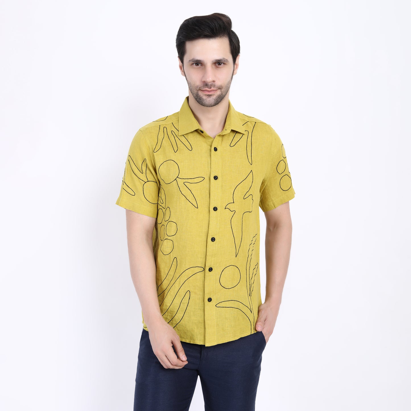 Lime Outline Embroidered Linen Half Sleeve Shirt