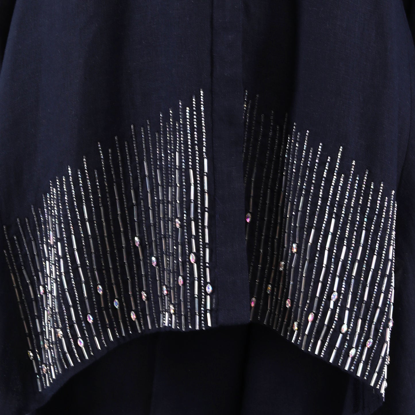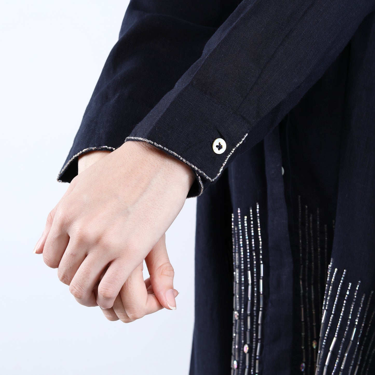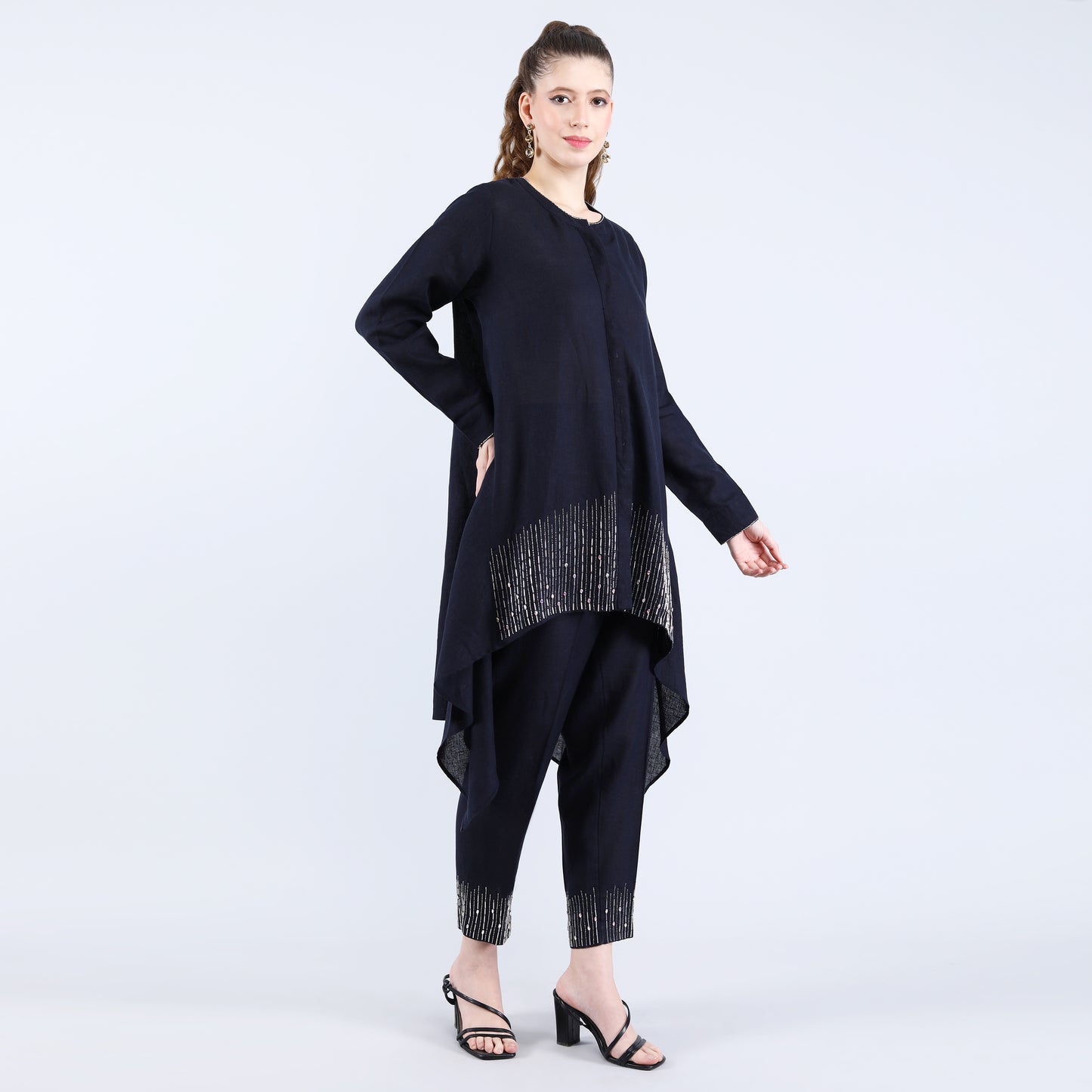 The Navy Tubelight Hand-Embroidered Tunic and Pants Set features intricate hand embroidery on luxurious Linen navy fabric. This elegant ensemble combines timeless craftsmanship with modern style, perfect for any occasion.