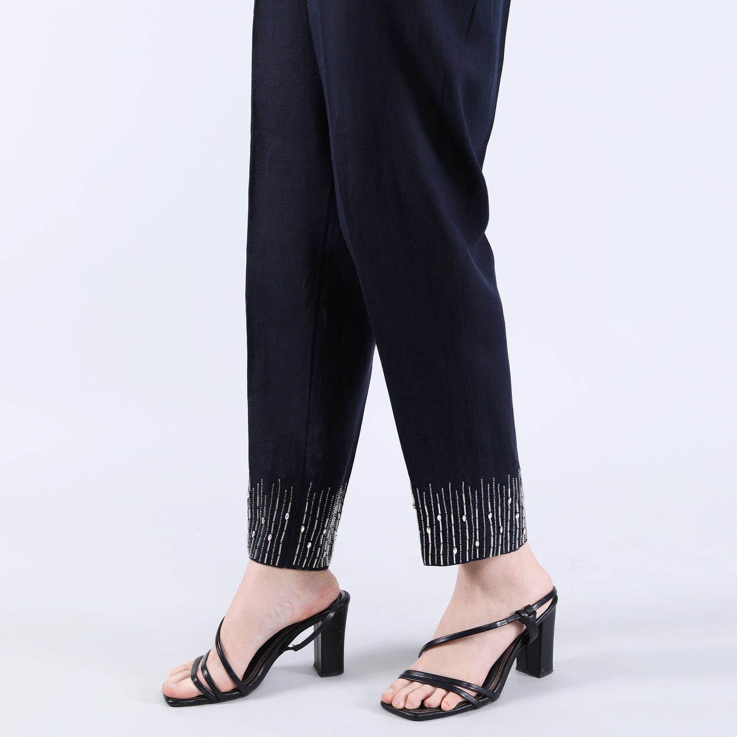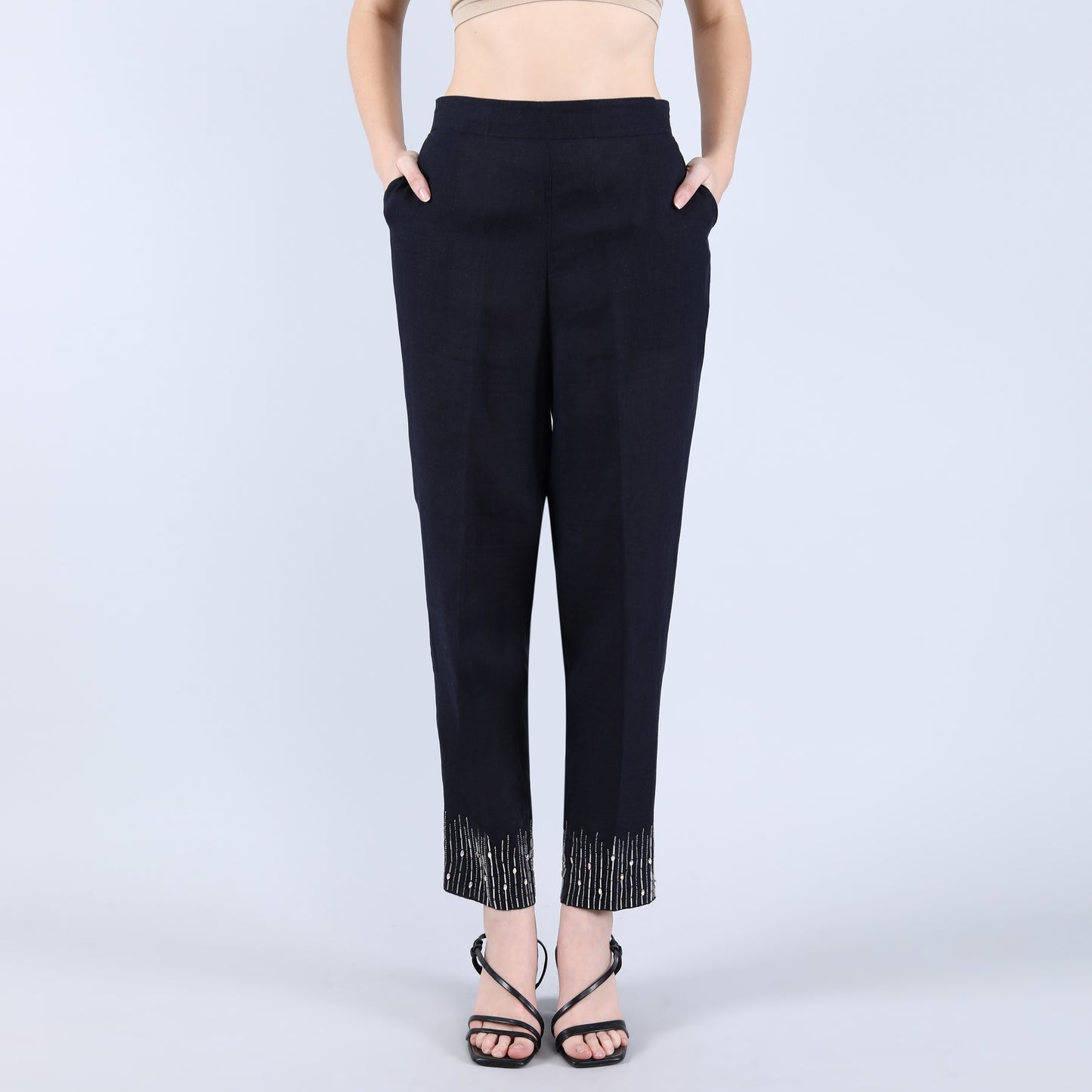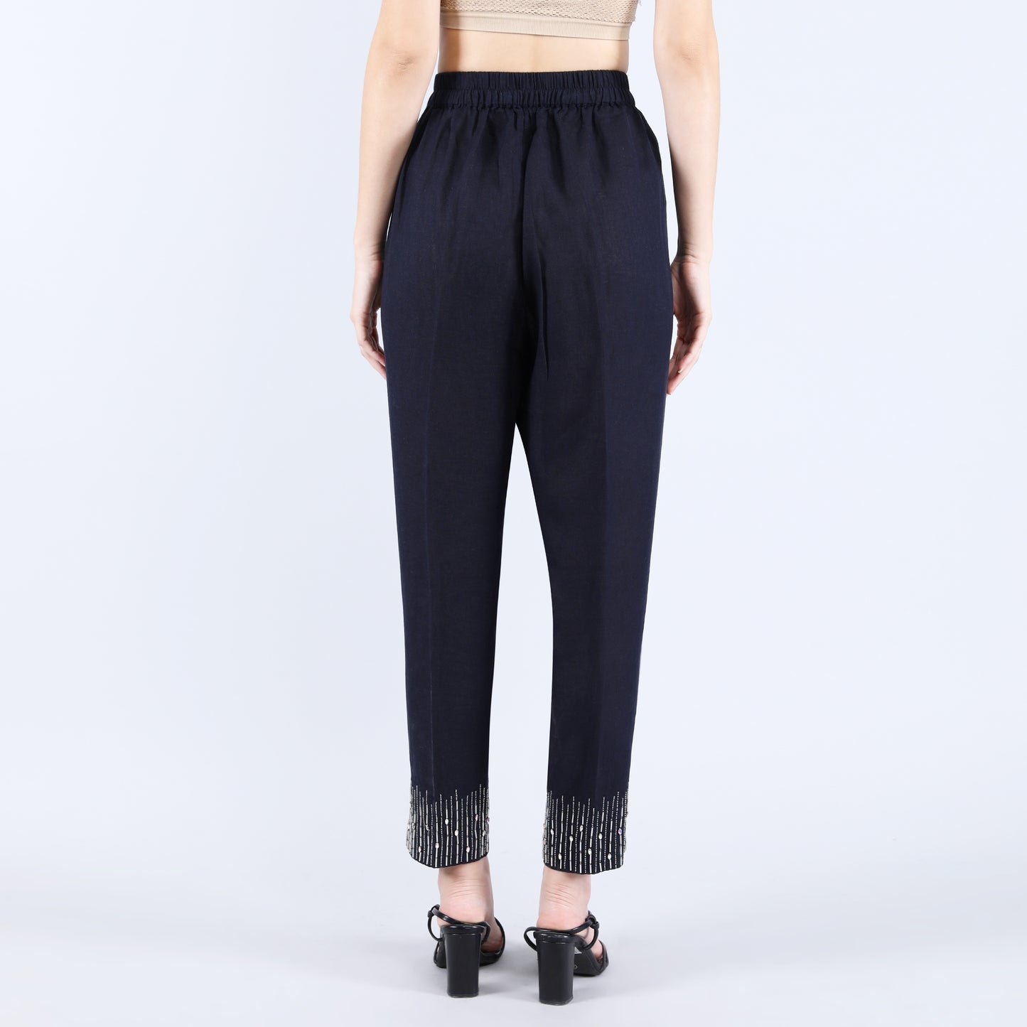 The Navy Tubelight Hand-Embroidered Tunic and Pants Set features intricate hand embroidery on luxurious Linen navy fabric. This elegant ensemble combines timeless craftsmanship with modern style, perfect for any occasion.
