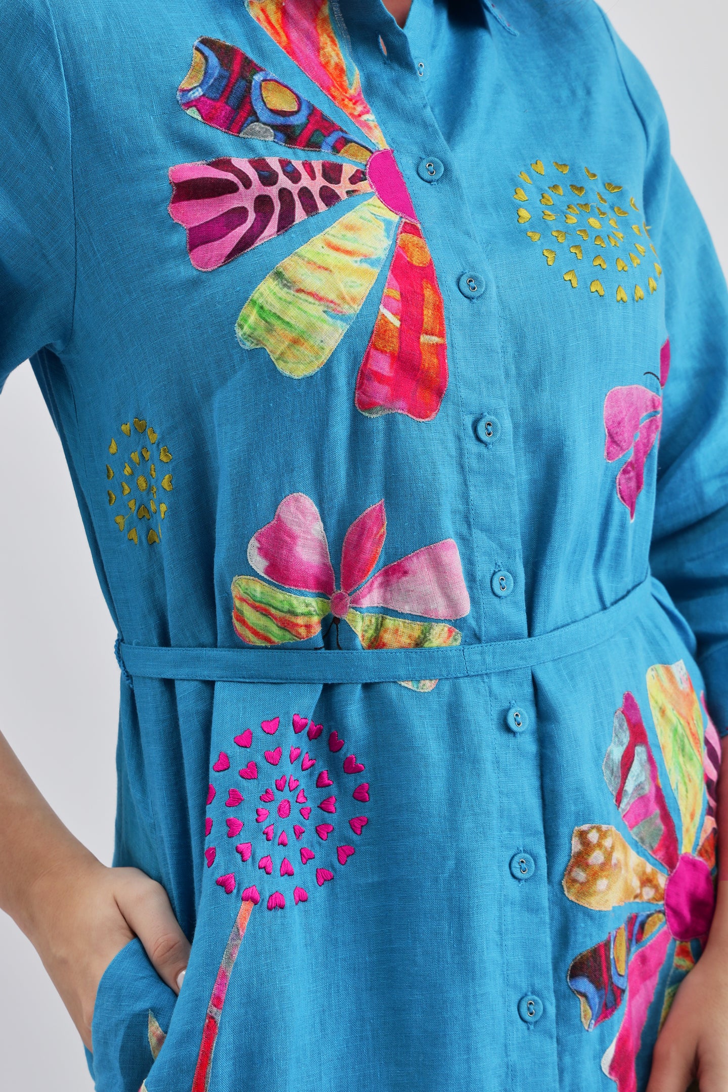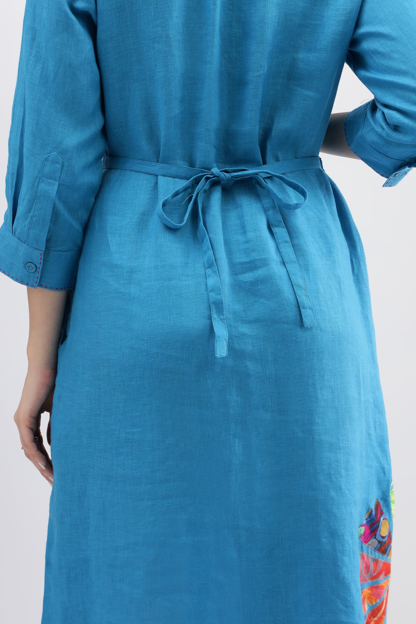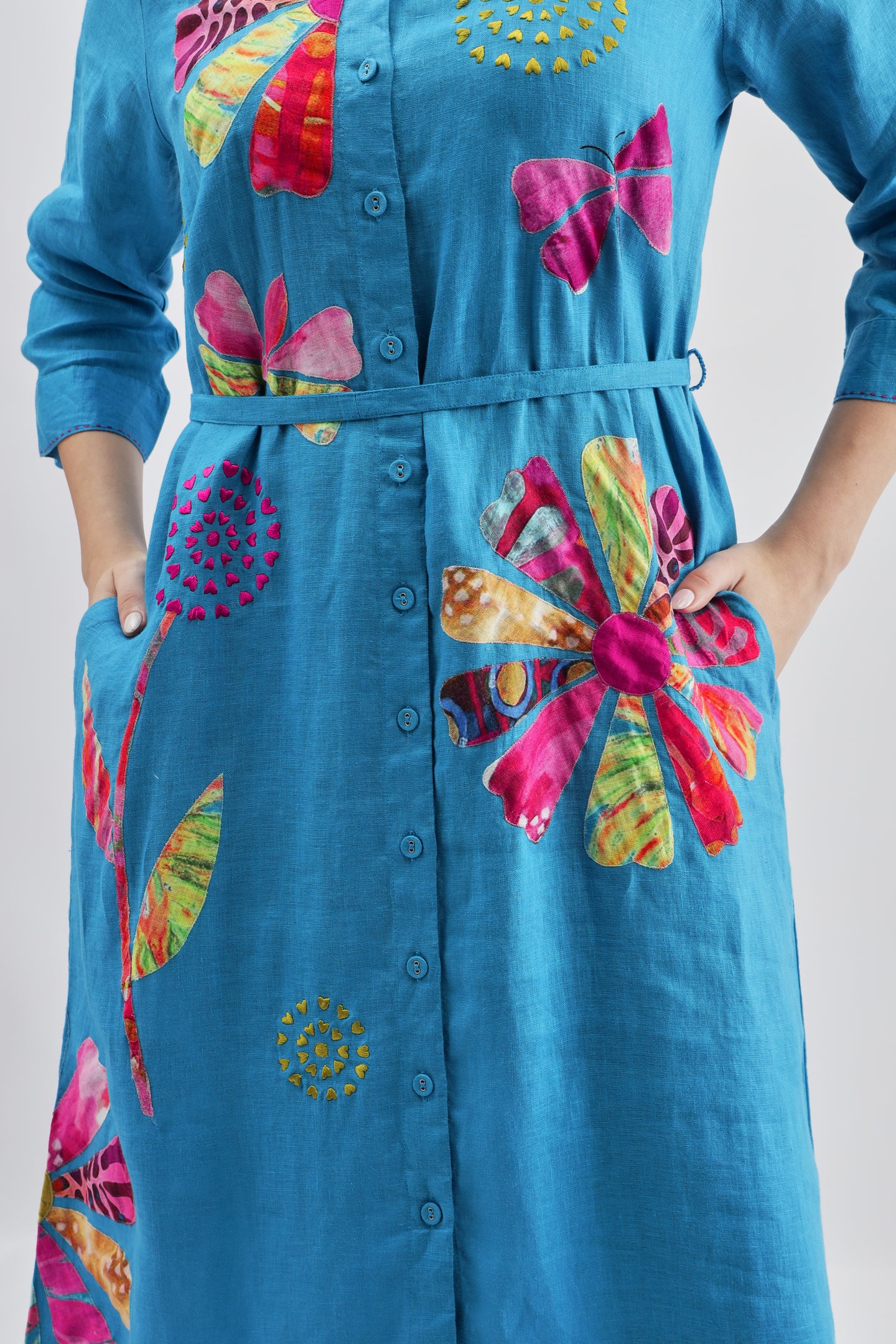 Turquoise Long Dress crafted from lightweight linen fabric, featuring intricate appliqué embroidery and a stylish belt at the waist for a flattering silhouette.