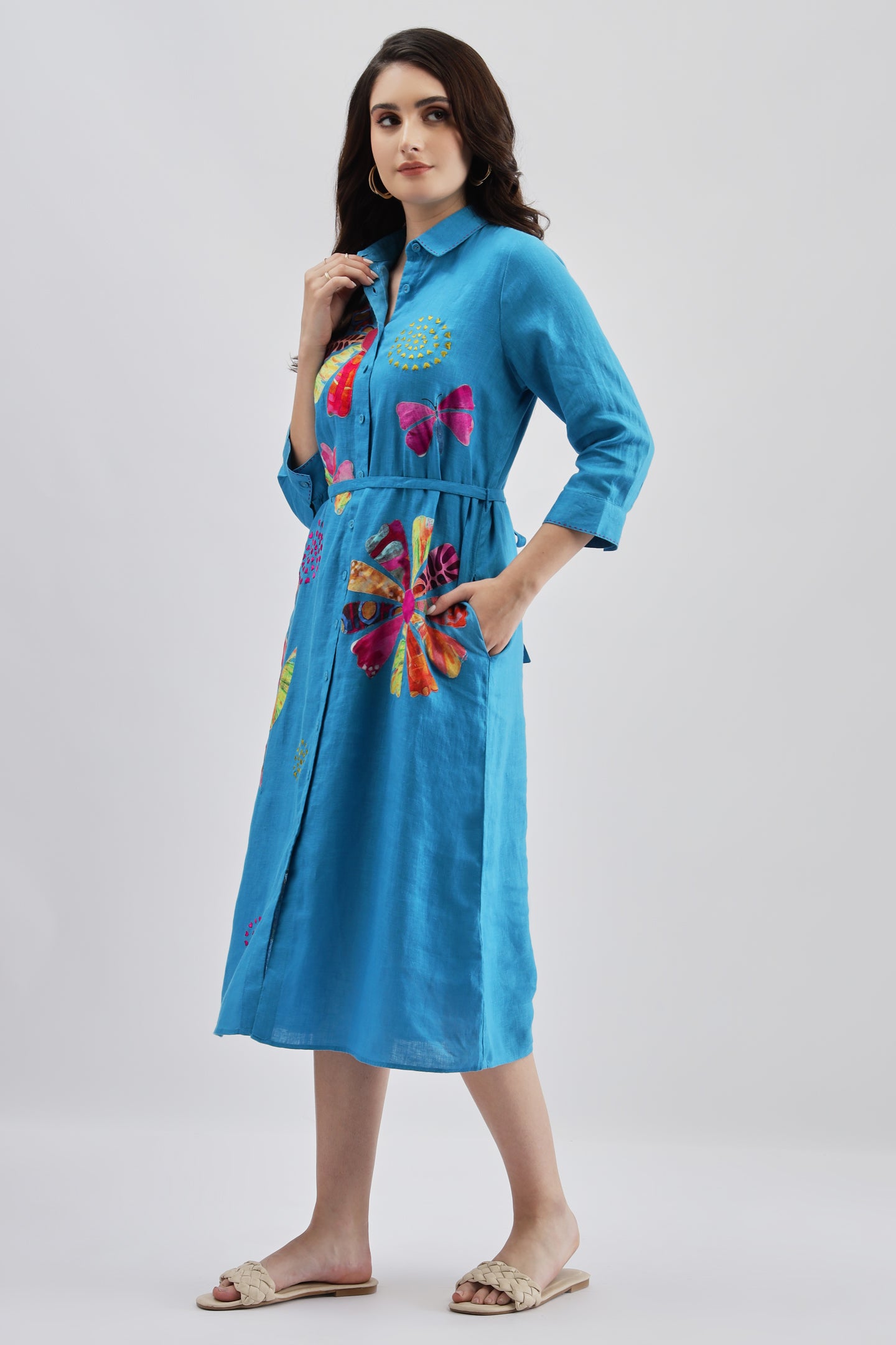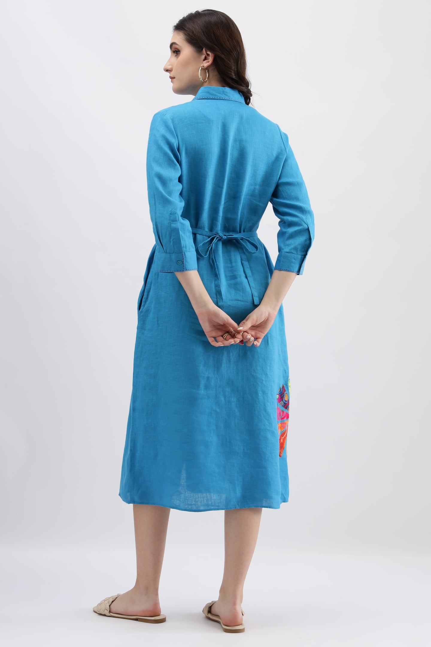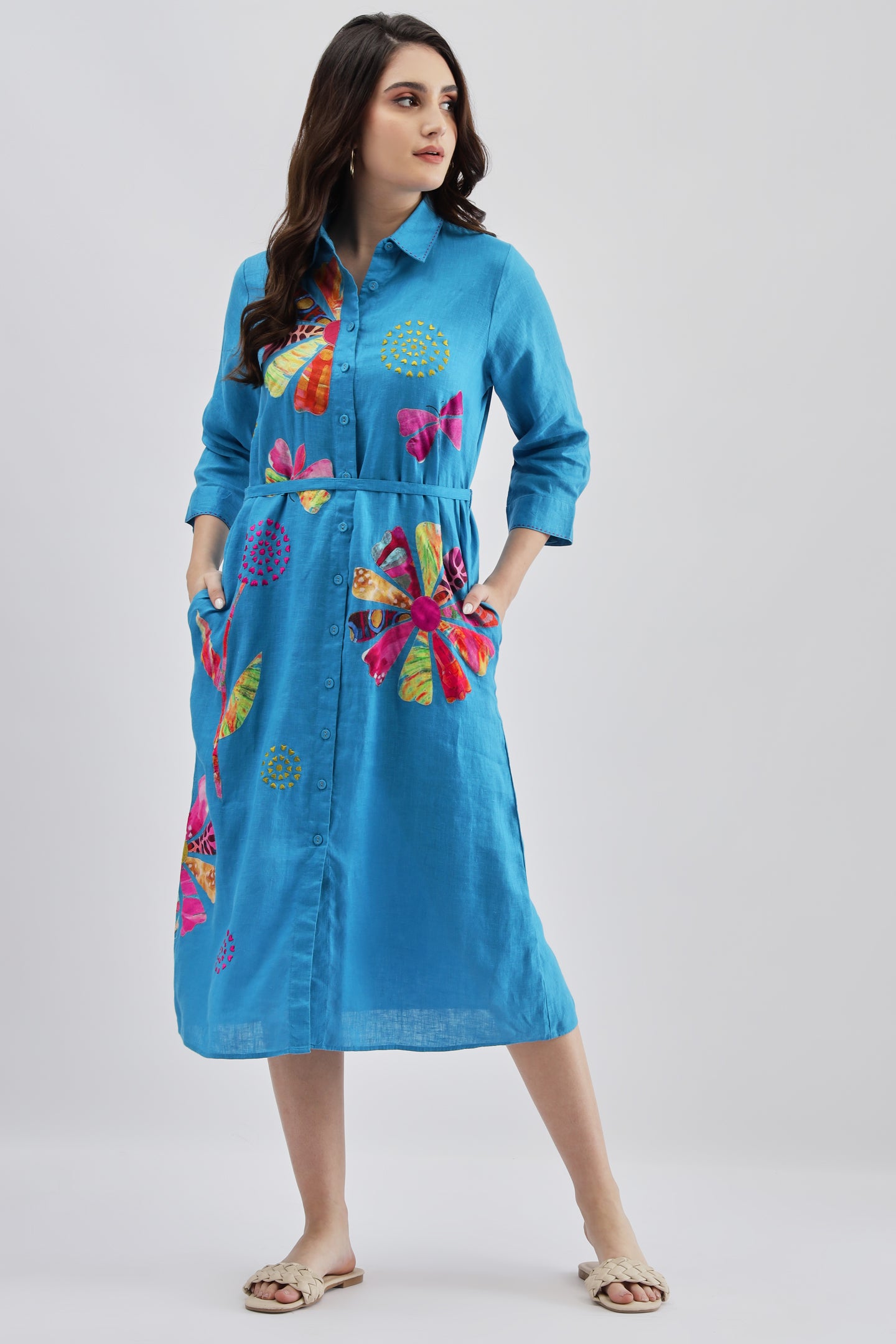 Turquoise Long Dress crafted from lightweight linen fabric, featuring intricate appliqué embroidery and a stylish belt at the waist for a flattering silhouette.