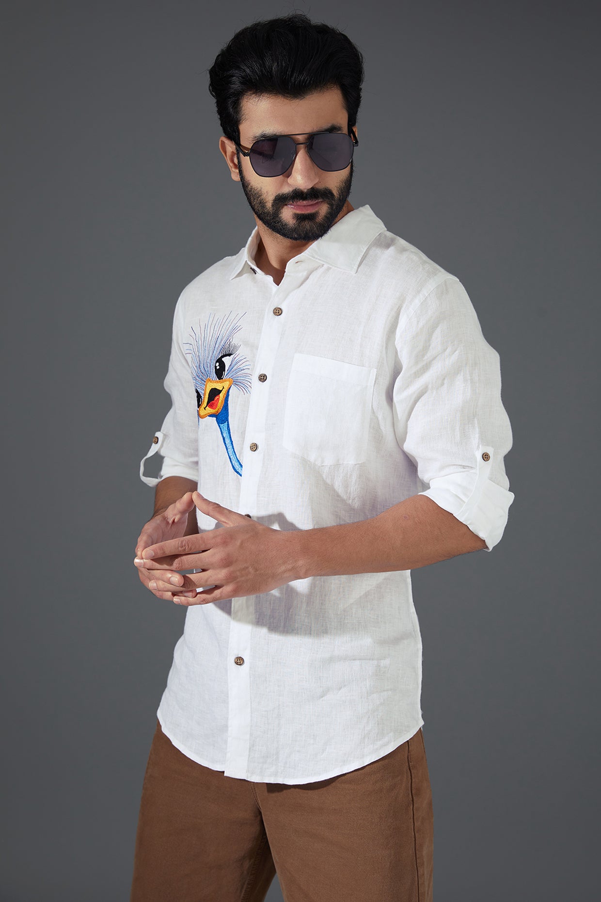 White Pure Linen Embroidered Shirt With Ostrich Embroidery